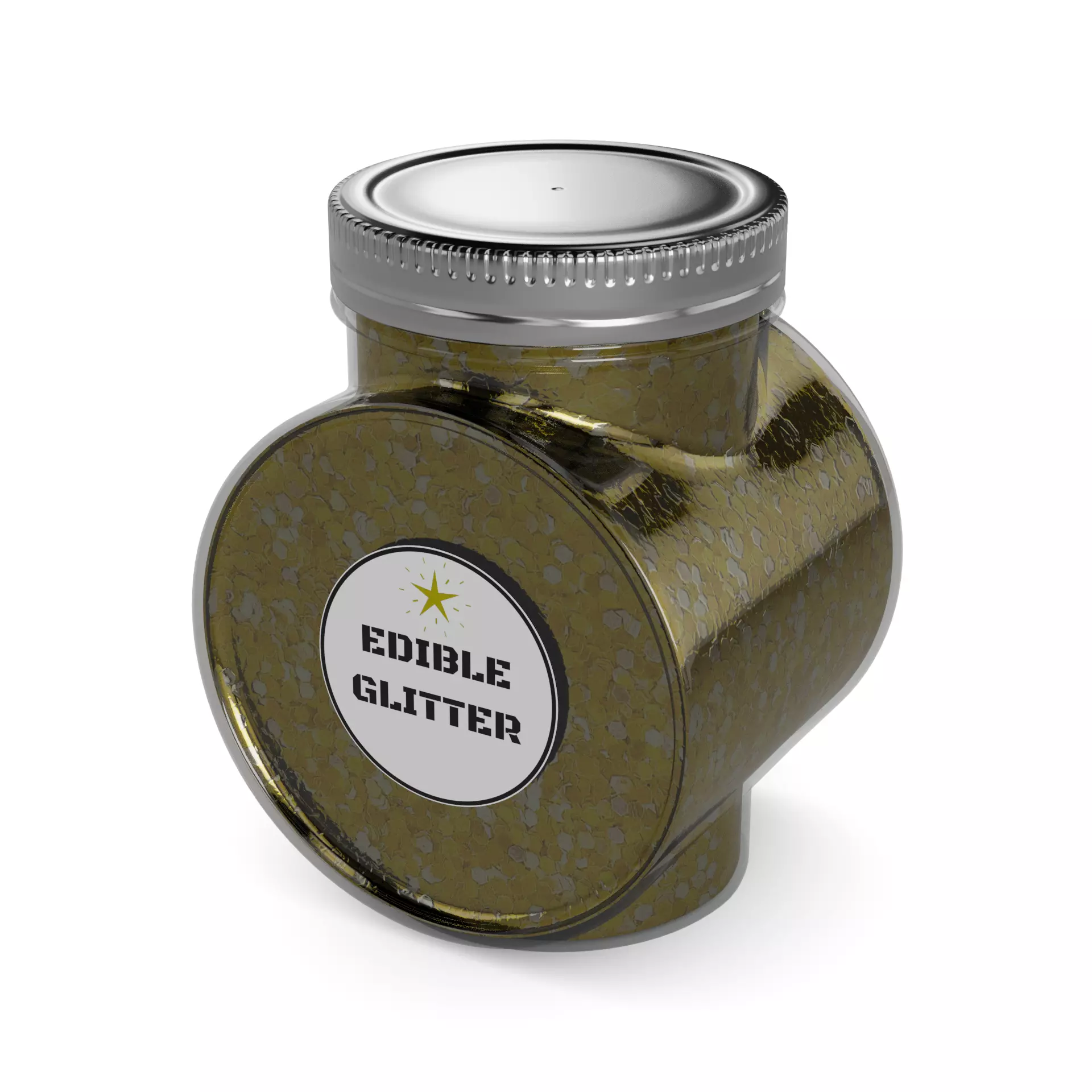 Edible Glitter: Add a touch of sparkle to your baked goods with this shimmering edible glitter. Packaged in a small glass jar with a metal screw-top lid, the glitter comes in a variety of colors, including gold, silver, and rainbow. The jar features a label with the words Edible Glitter in elegant, cursive font, along with a graphic of a sparkling star.