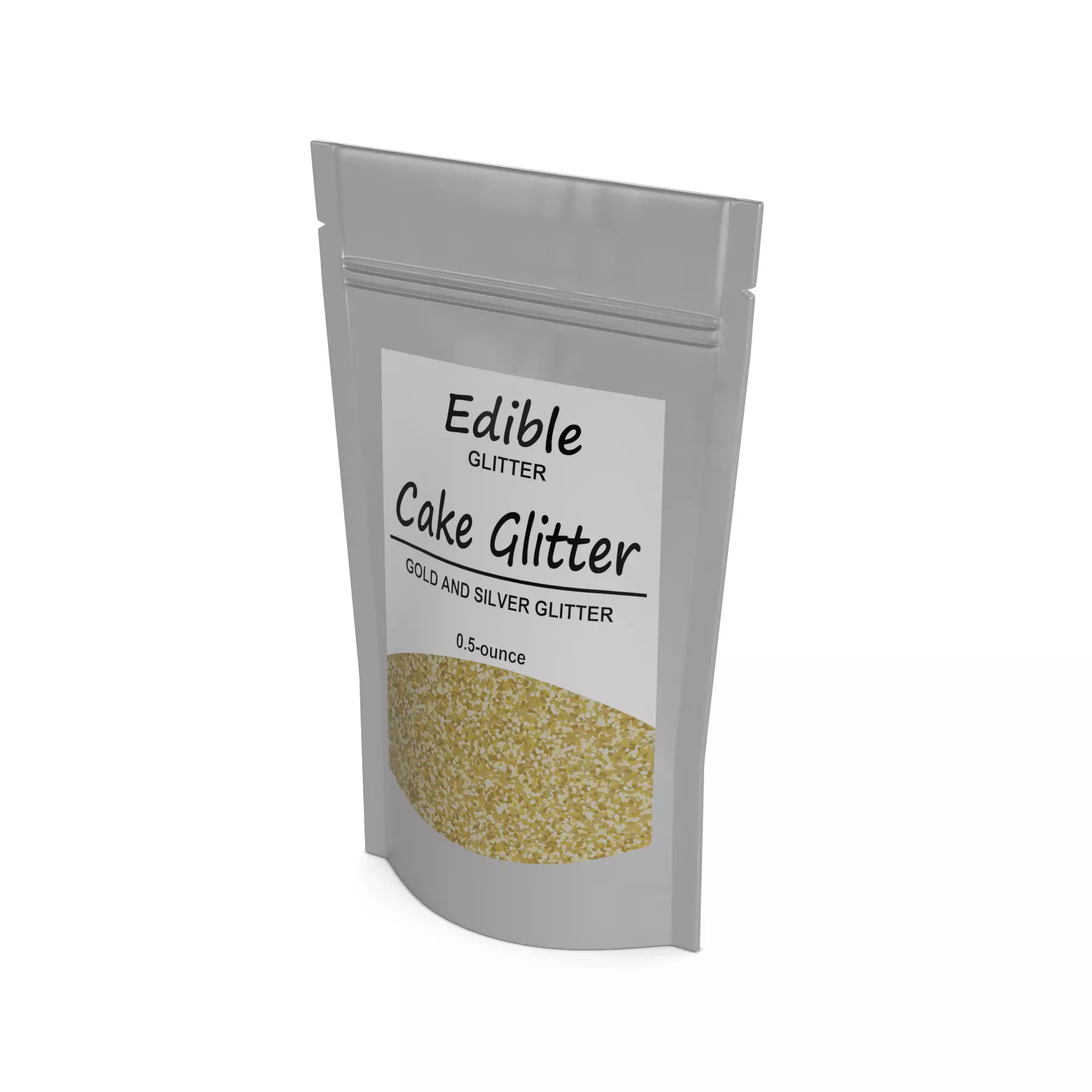 Edible Glitter: Add a touch of sparkle to your baked creations with this edible glitter. Packaged in a small, resealable plastic pouch, this 0.5-ounce pack contains a mix of gold and silver glitter. The pouch features a label with the words Edible Glitter in elegant, cursive font, along with a graphic of a sprinkle of glitter falling onto a cake.