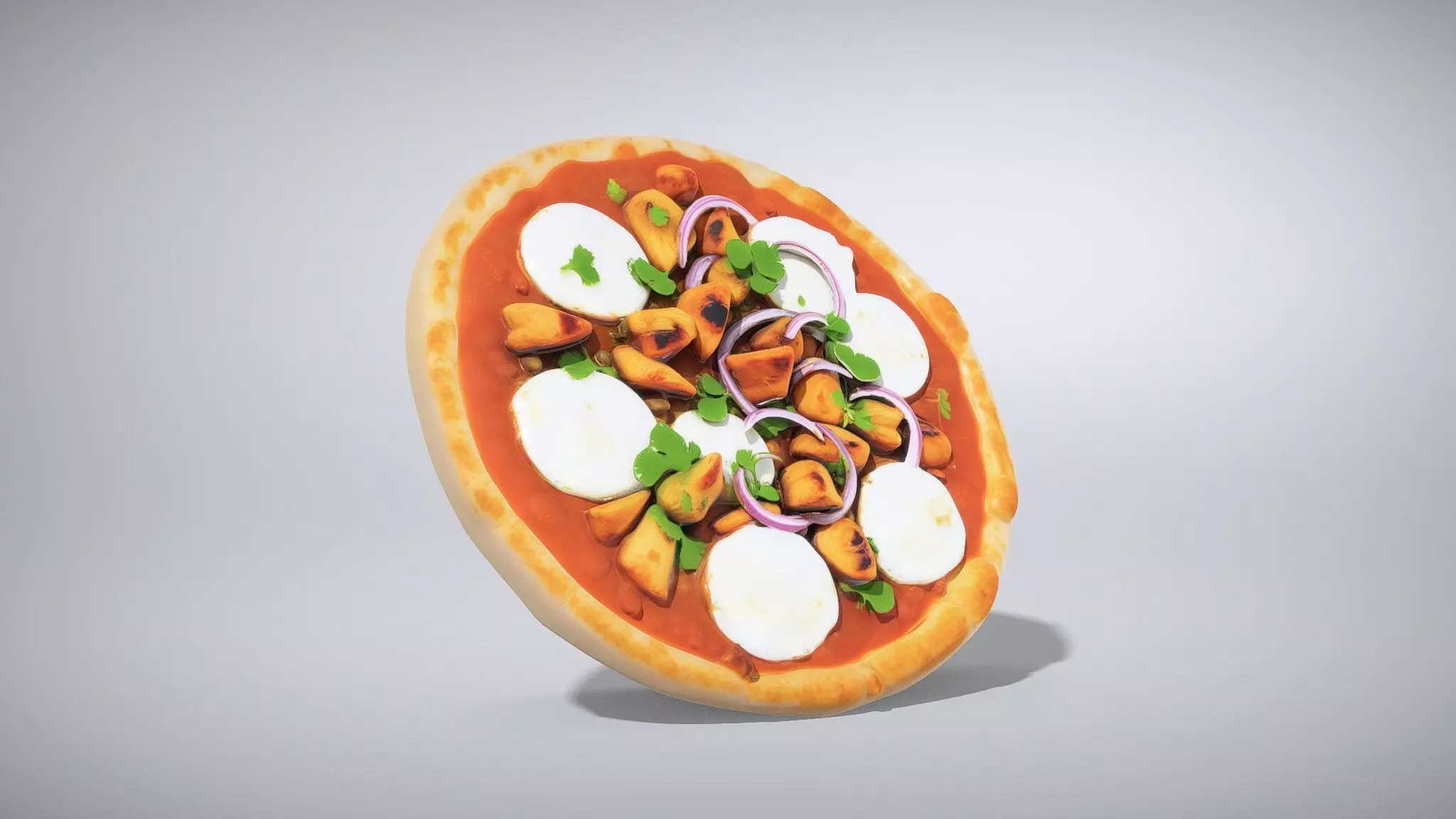 This BBQ Chicken Pizza features a golden-brown crust, rich barbecue sauce, and a medley of toppings including grilled chicken, mozzarella, red onions, and cilantro. Each model has 3 levels of detail with QUAD polygons: