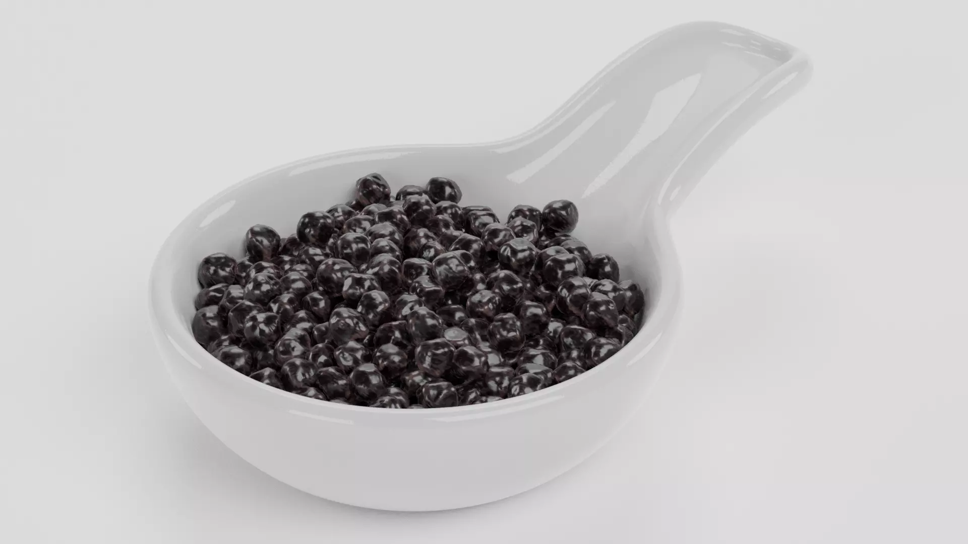 Realistic black caviar arranged as a ready-to-use serving composition. The asset combines clustered fish roe with a small ceramic appetizer spoon, forming a stable and visually coherent food element. The caviar material is supporting a natural look in close-up renders. The tasting spoon features a clean white ceramic surface and adds a luxury seafood serving context. The overall structure is allowing easy placement within food scenes, still life compositions, or product-focused setups.