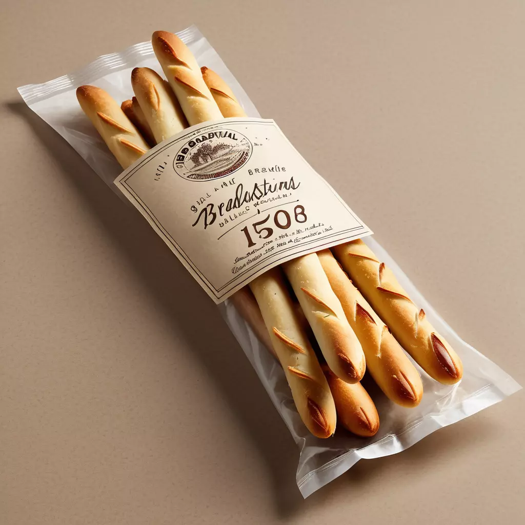 Discover the perfect accompaniment to your meals with these slender bread alternatives. Packaged in a rustic, brown paper bag, these breadsticks exude a homemade charm. The bag is adorned with a vintage-style label, featuring a simple illustration of the breadsticks and a handwritten font. Inside, you'll find a generous serving of 15 breadsticks, each measuring approximately 7 inches in length. These artisanal breadsticks are baked to perfection, offering a delightful crunch and a hint of saltiness.