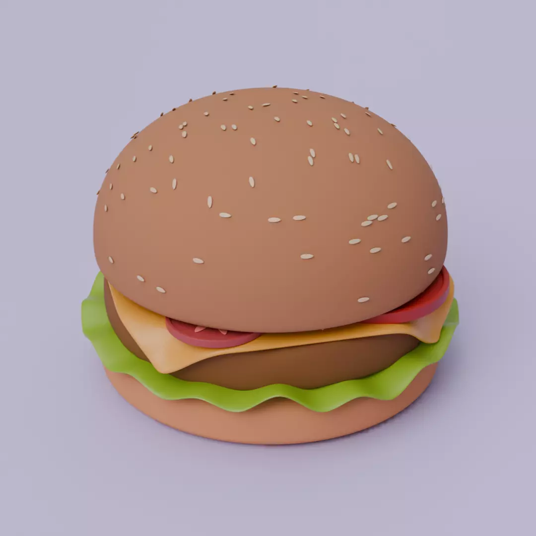 This is a high-quality stylized 3D burger model, perfect for use in games, animations, renders, advertising, and AR/VR projects.The model includes bun, cheese, salad, tomato, and sesame seeds with clean topology and UV unwrapping. • Formats included: .blend, .fbx, .obj + .mtl, .glb • Polygon count: ~121k • Textures/Materials: Basic colors with UV mapping (ready for customization) • Game-ready: Optimized for rendering and real-time engines • Render Engine: Cycles (compatible with Eevee)