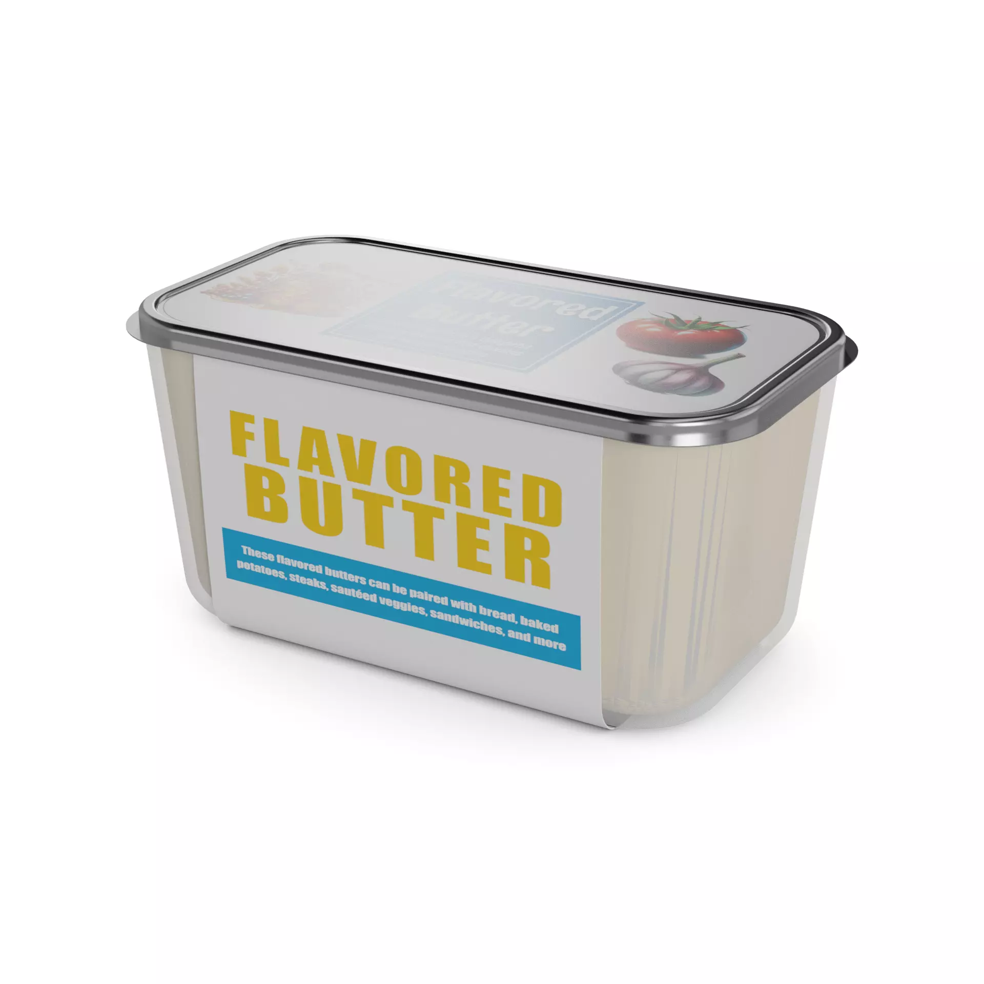 Flavored Butter: A rectangular block of flavored butter, wrapped in a colorful foil packaging. The packaging is adorned with a label that showcases the words Flavored Butter in bold and vibrant letters, along with illustrations of the ingredients used to create the unique flavors, such as herbs, garlic, or honey.