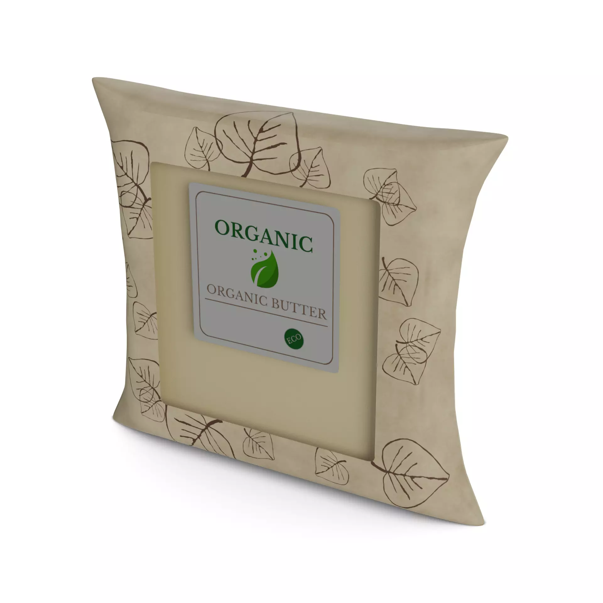 Organic Butter: A square-shaped block of organic butter, encased in a biodegradable wrapper made from recycled paper. The wrapper is imprinted with a label that proudly displays the words Organic Butter in earthy tones, along with a graphic of a leaf to signify the natural and sustainable nature of the product.