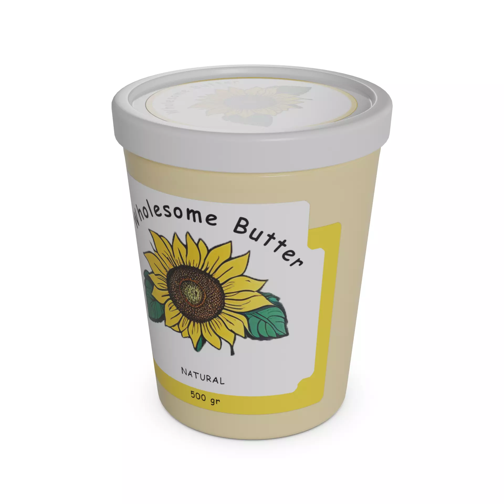 Wholesome Butter: A tub of wholesome butter, packaged in a plastic container with a warm yellow lid. The container is adorned with a label that features the words Wholesome Butter in a friendly and inviting font, along with an illustration of a sunflower to represent the natural and nourishing qualities of the butter.