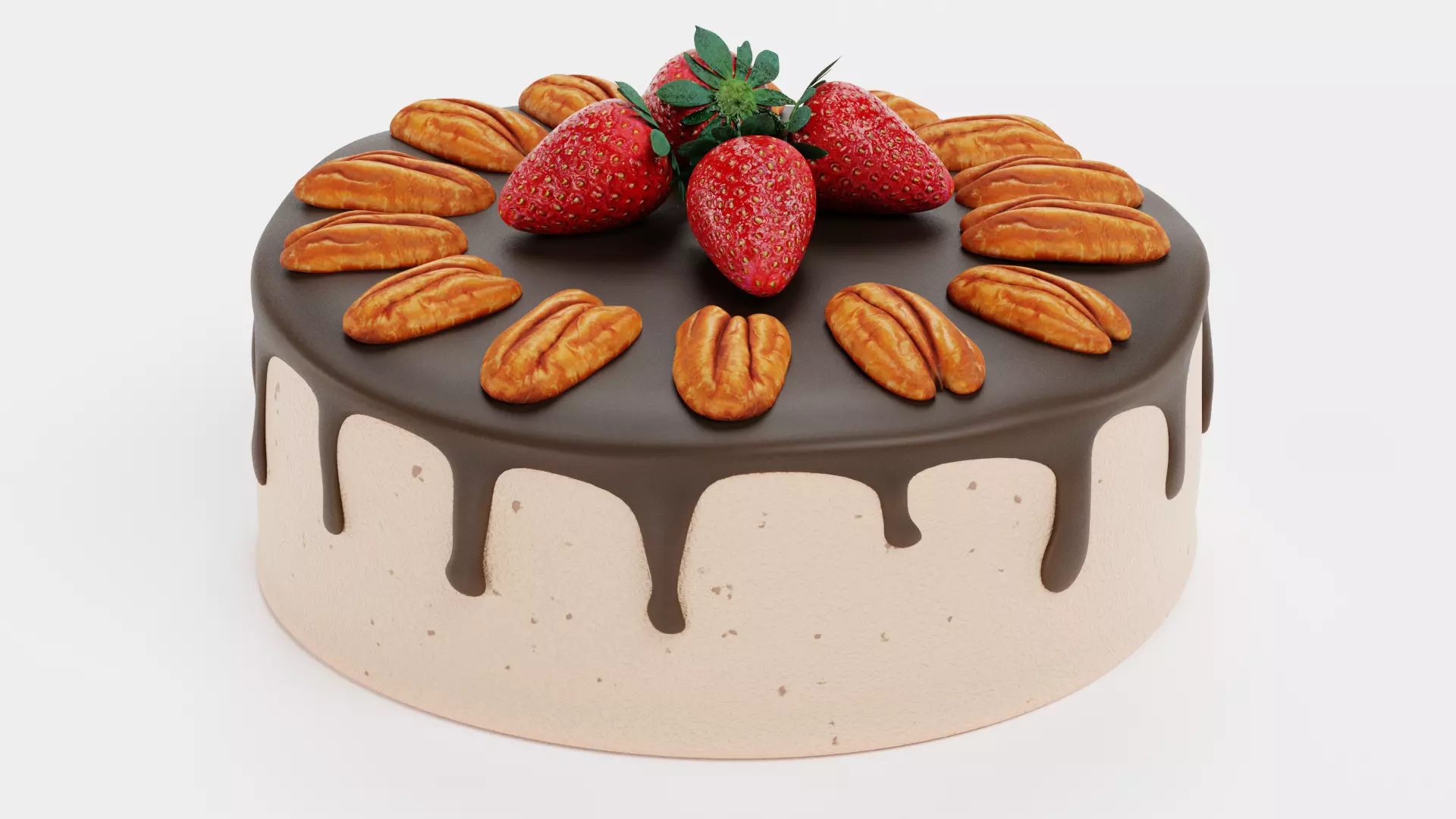 A pecan cake designed as a rich dessert asset with a layered confectionery base and a topping-driven surface. The flowing chocolate layer defines the upper structure and connects the elements into a single, cohesive form. Pecan nuts and whole fruit introduce a more natural, handcrafted feel. The combination creates a bakery-style dessert that works as a focal element in food presentation scenes, cafe setups, and catering displays.