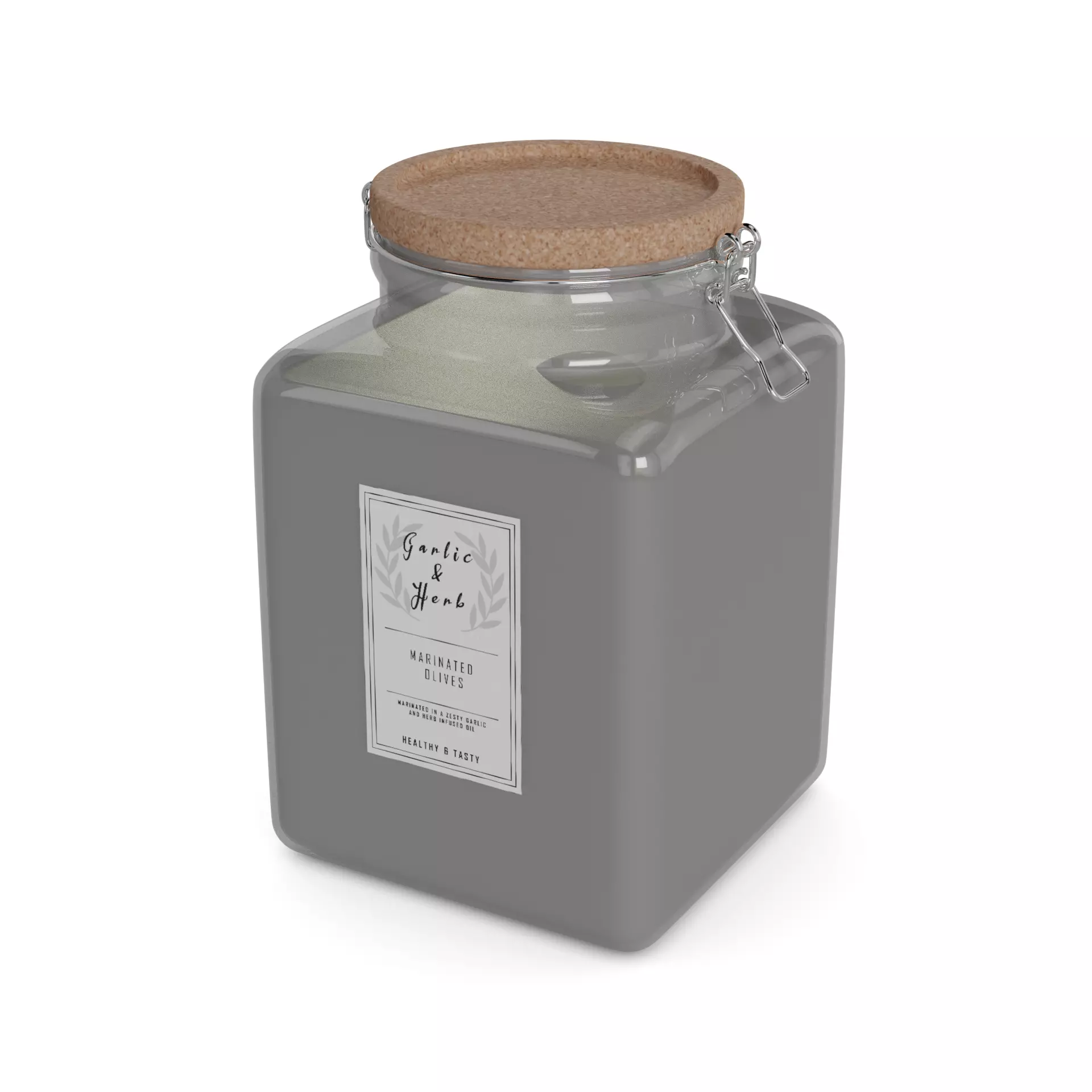 Canned Olives: This rectangular glass jar is filled with a mix of green and black olives, marinated in a zesty garlic and herb-infused oil. The jar has a hinged metal lid, allowing for easy access to the olives. The label on the jar showcases a rustic design, with earthy tones and a subtle olive branch illustration. It includes the text Garlic and Herb Marinated Olives in a handwritten-style font. The jar is a medium size, perfect for adding a burst of flavor to your favorite dishes.