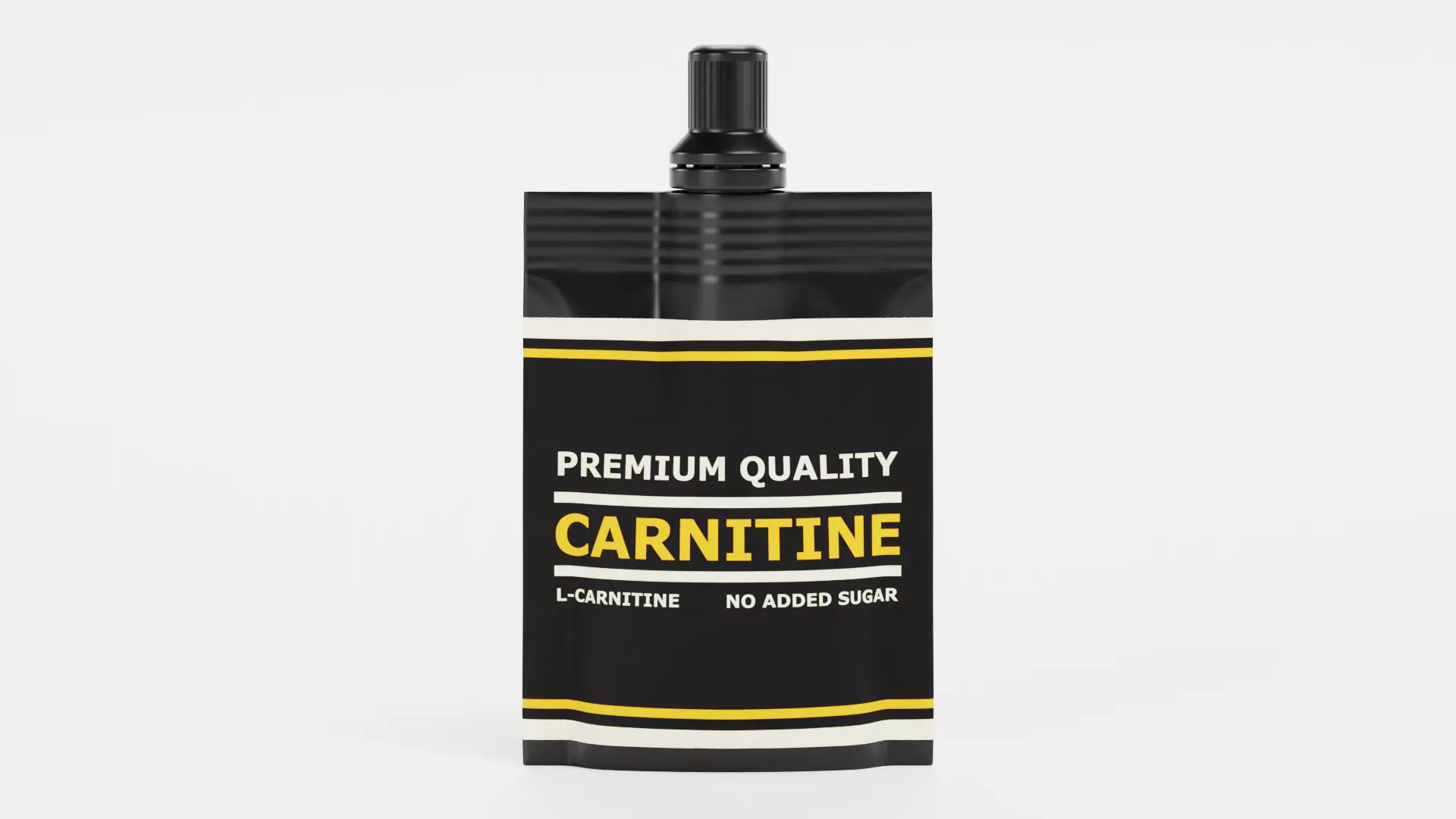 A detailed 3D model of a spout pouch packaging concept designed for a generic Carnitine Gel product. This neutral, brand-free packaging design reflects a realistic sport supplement format commonly used in the nutrition and fitness industry. The dark laminated surface, plastic screw-top cap, and clean, premium graphic layout emphasize production-level realism while keeping the presentation fully customizable.