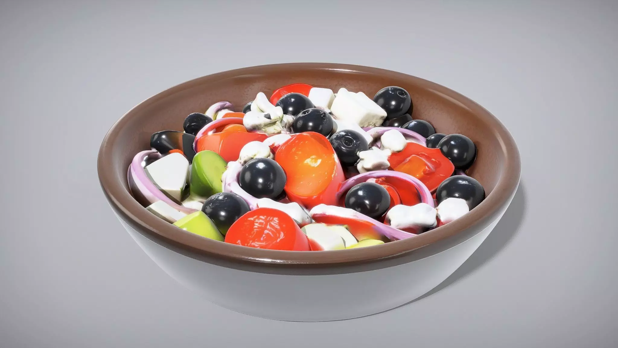 This model showcases a beautifully crafted ceramic bowl filled with a colorful Greek salad, perfect for culinary displays or restaurant environments. Each ingredient is meticulously detailed, from the vibrant colors of the vegetables to the texture of the feta cheese.