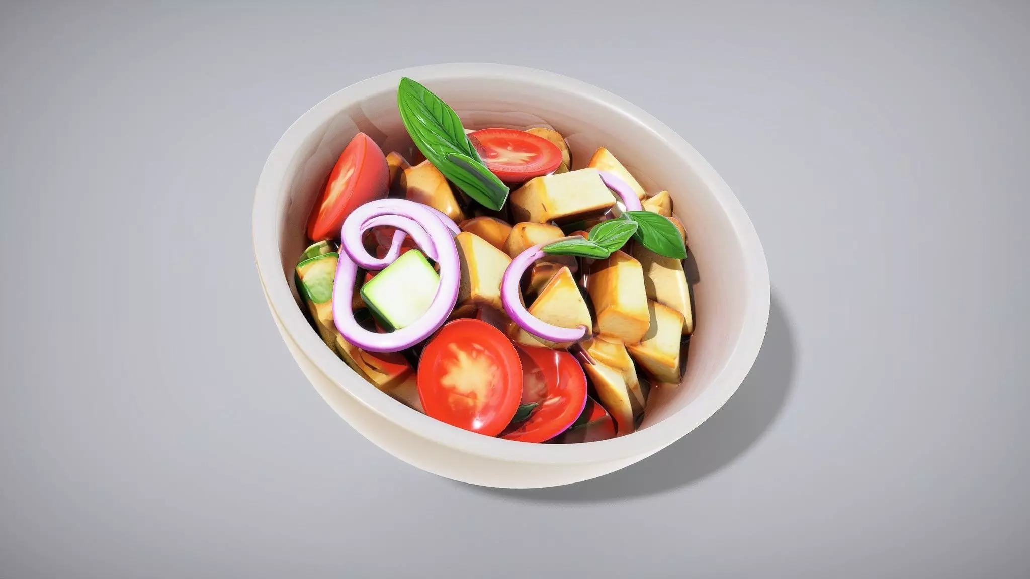 This ceramic bowl showcases a colorful Panzanella salad, ideal for summer dining. Each model has 3 levels of detail with QUAD polygons: