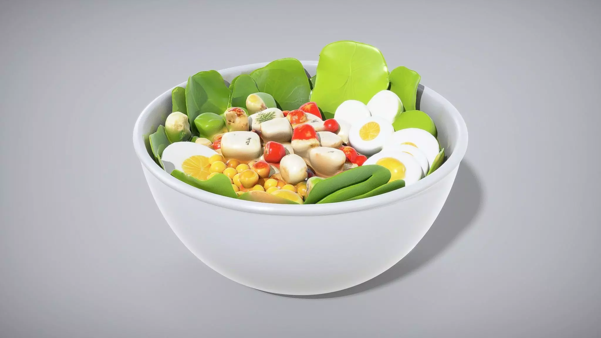 This ceramic bowl features a glossy white finish and a deep, rounded shape, perfect for serving vibrant salads. Each model has 3 levels of detail with QUAD polygons: