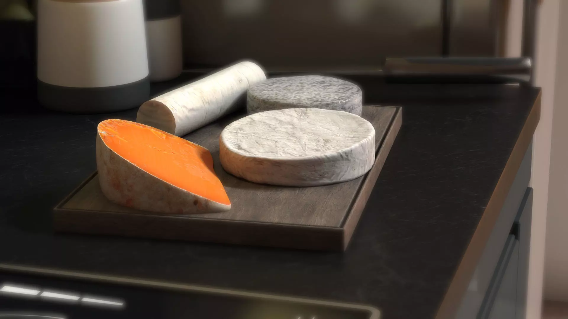 The scene, lighting and cameras, and all the cheese FBX are included.The models, materials and textures have logical names; Model is built to real-world scale. Units - cm.Polycount of each cheese:Orange cheese : 1376polys / 2752trisCamembert : 2848polys / 5696trisCheese Log (bûche) : 202polys / 436trisGoat Cheese (chèvre cendrée): 417polys / 830tris