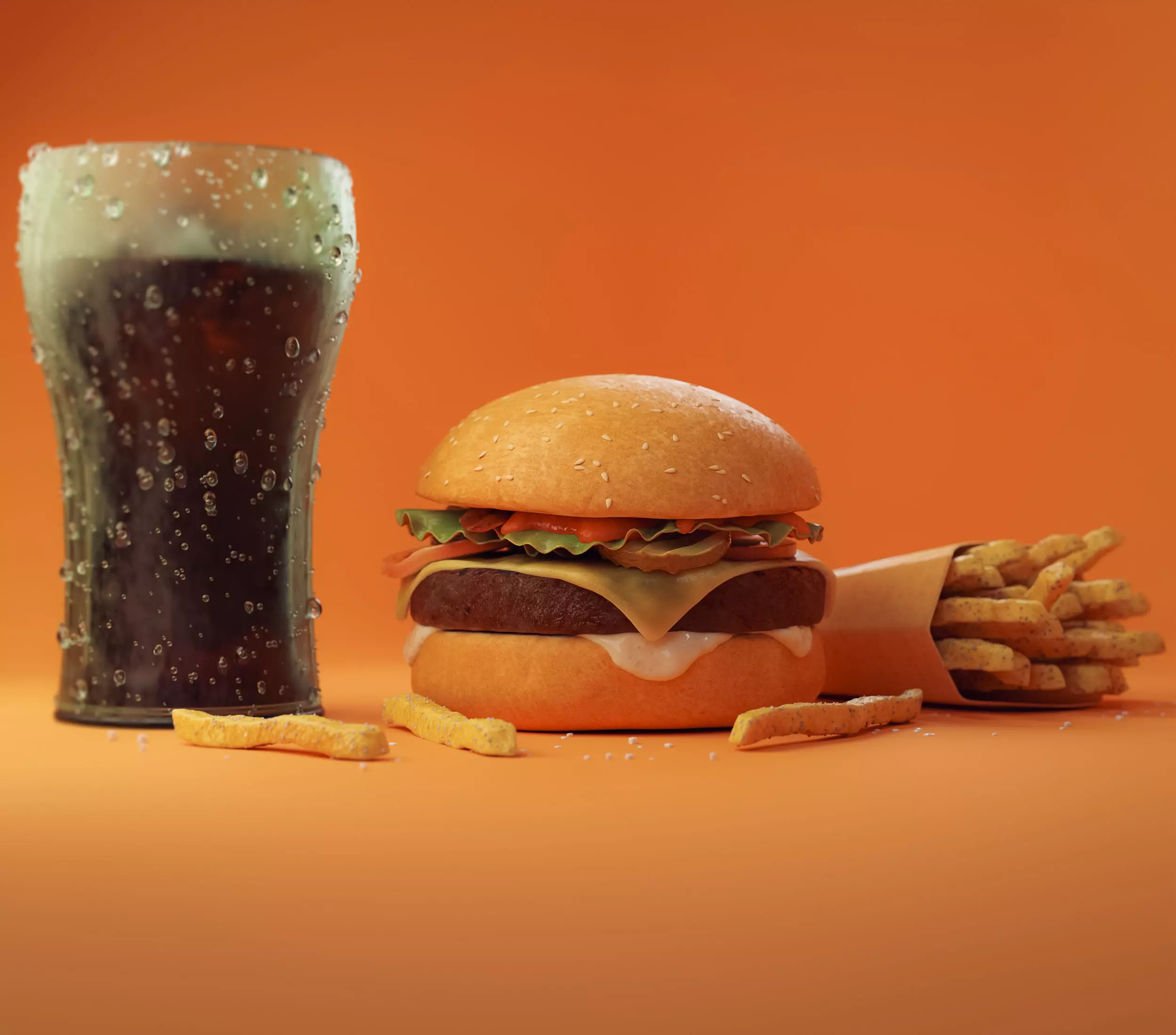 This Cheeseburger meal with french fries comes with bacon, lettuce, tomato, onion, pickles, mild mayo, french fries and a glass of soda. The model was originally created with Blender 4.0 and Zbrush. These models are suitable for use in high-res film close-ups, advertising, design visualization and games.