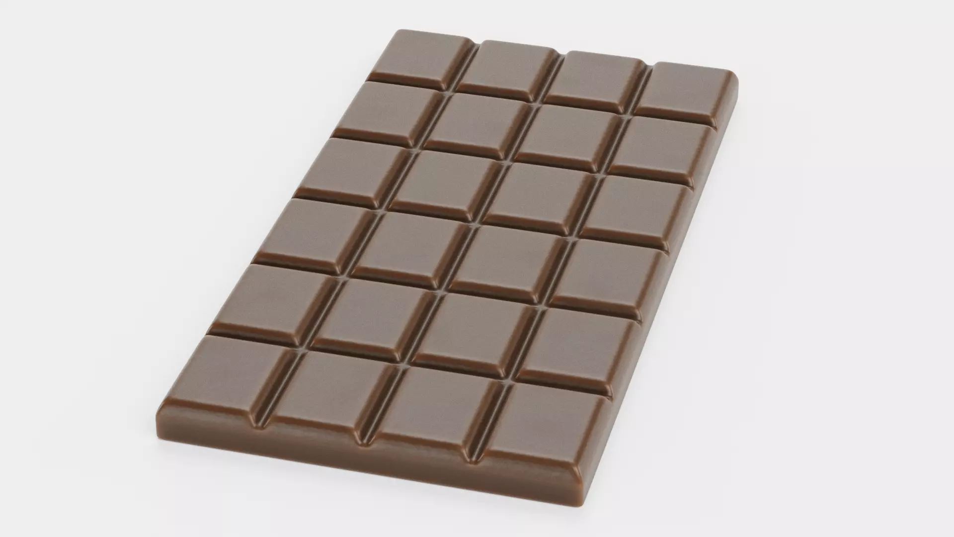 A milk chocolate bar designed as a classic segmented tablet with a clean grid layout and clearly defined chocolate blocks. The balanced proportions and medium profile establish a familiar confectionery form. Subtle beveling along the edges softens the geometry and supports realistic light interaction across the surface. A matte chocolate finish keeps the structure visually clear. The unwrapped format allows flexible placement across dessert compositions, product visuals, and food-focused environments.