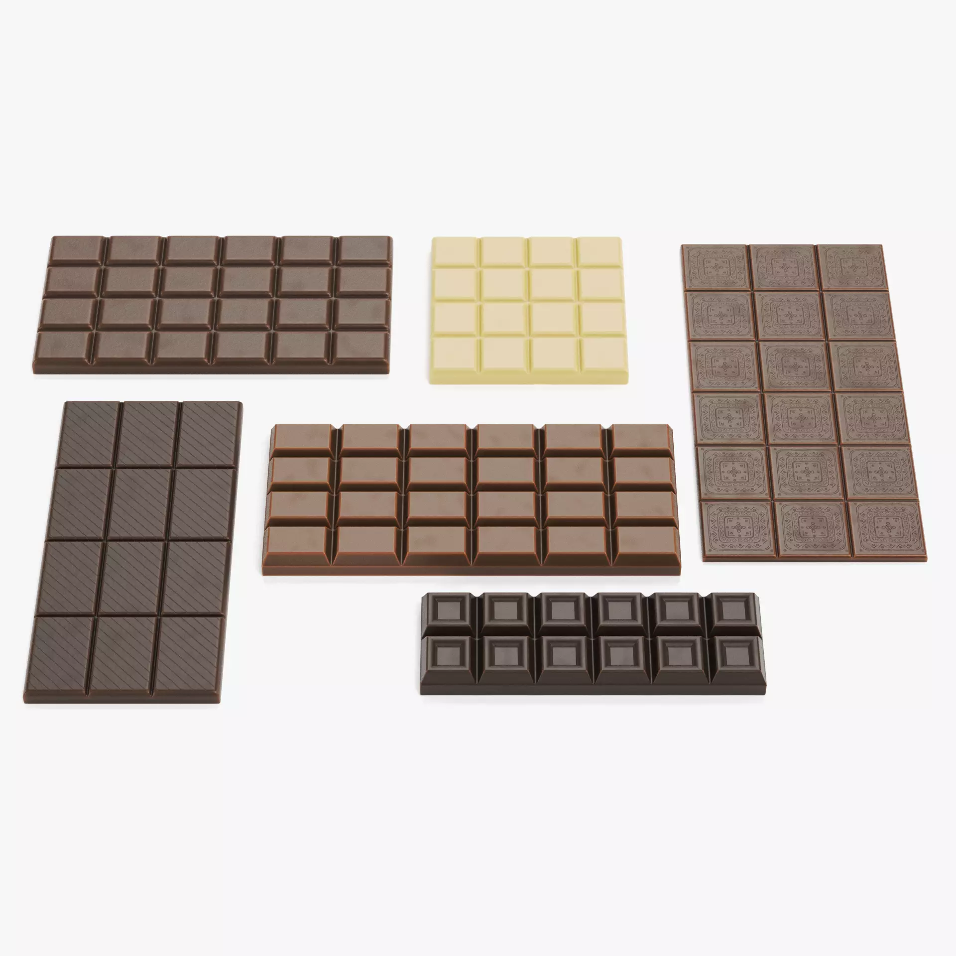 A collection of chocolate bar assets covering a range of segmented tablet formats, from compact snack pieces to full-size blocks with varied profiles. The set includes both milk and dark chocolate materials, along with a white chocolate variant, introducing natural material variation across confectionery scenes. Differences in thickness, layout, and surface treatment allow flexible use. The unwrapped format supports direct placement across dessert scenes, food visualization, and confectionery arrangements.