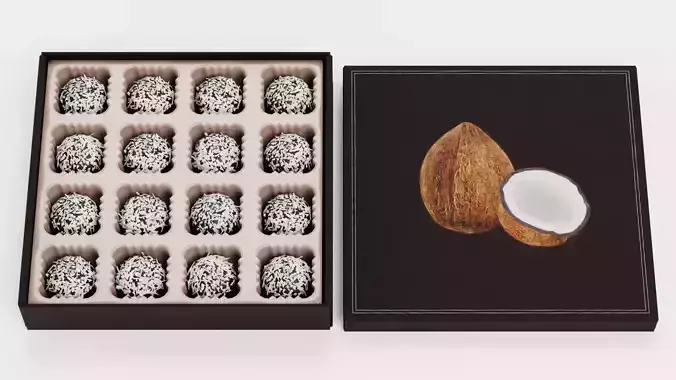 A dark-toned chocolate box designed for a single praline type, featuring a realistic gold interior tray filled with 16 round coconut-coated chocolates. The box comes with a matching lid printed with a detailed coconut graphic, keeping the design unbranded yet visually distinctive. Both parts are modeled with clean proportions and subtle premium cues, making the asset suitable for packaging mockups, product renders, or elegant food scenes. The lid can be placed on or beside the box for flexible presentation.