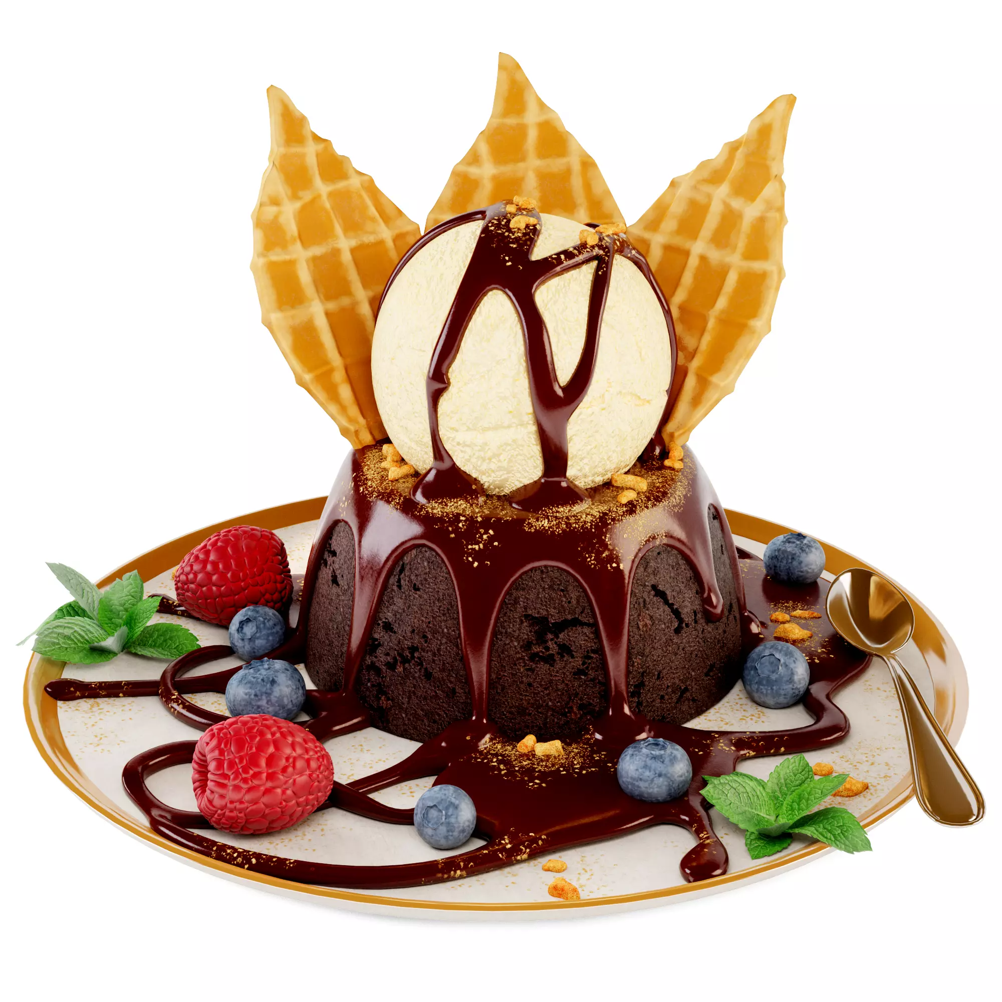 • A model of a chocolate dessert with ice cream and waffles, poured with liquid chocolate and sprinkled with cookies.