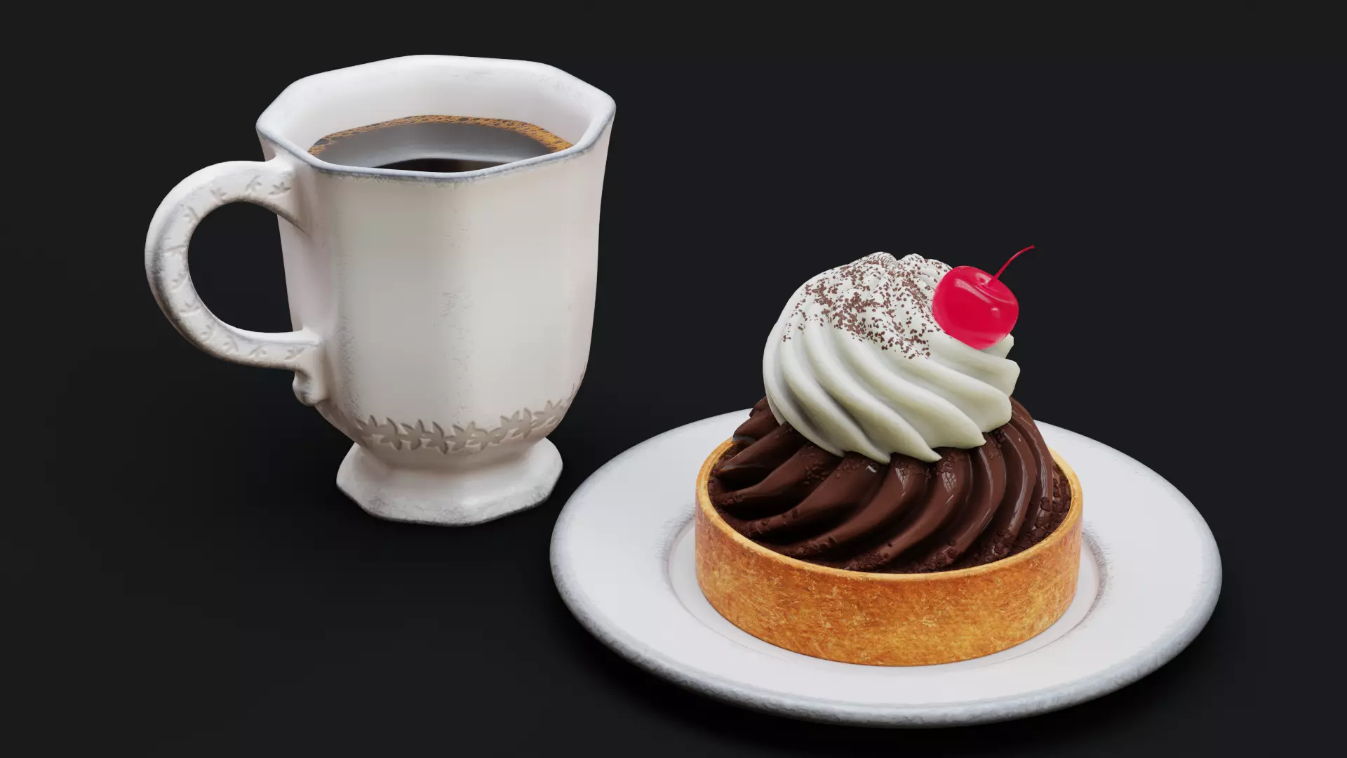 THIS MODEL CONTAINS:1 Rustic Cup with coffee1 Chocolate Pie1 Rustic Plate