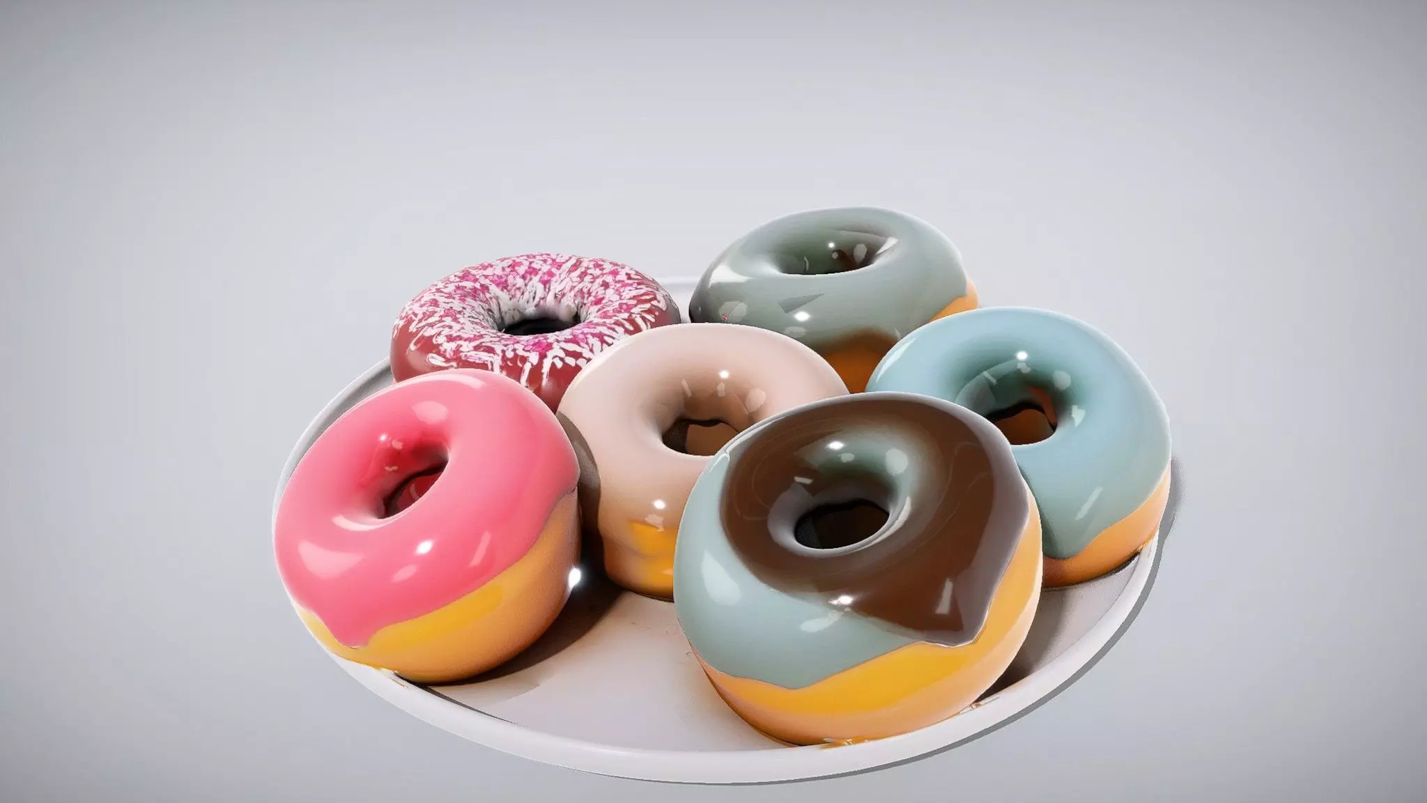This model features a set of colorful glazed donuts presented on a round white plate. Each donut is adorned with rich chocolate and sparkling sugar glazes, emphasizing their fresh and appetizing appearance. The model is suitable for various uses, from food-related visualizations to bakery displays. Each model has 3 levels of detail with QUAD polygons: