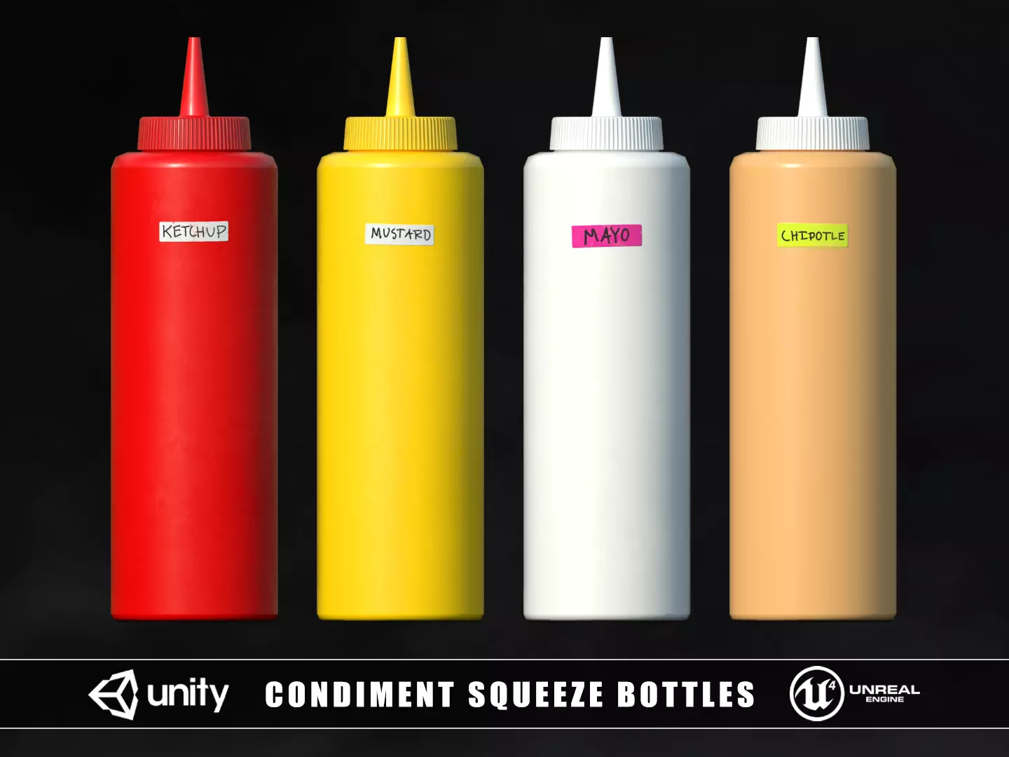 Condiment Squeeze Bottles 3D model. This model comes with a squeeze bottle with textures for ketchup, mustard, mayo and chipotle. Modeled in Maya and textured with Substance Painter and Photoshop. The model is built to scale and is UV unwrapped with 2k textures. Includes 3D model and textures!