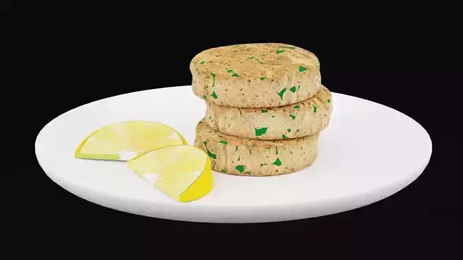 This 3D model features a Crab Cakes Plate, showcasing a set of perfectly golden, pan-seared crab cakes served on a decorative plate. The crab cakes display a crispy exterior with flaky textures and realistic char marks, paired with a garnish of fresh greens and a small dipping sauce on the side. Ideal for seafood, appetizer, or fine dining-themed renders, this high-poly model adds a gourmet touch to your culinary scenes. Available in OBJ, DUF, and FBX formats.