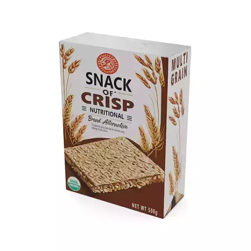 Multigrain Crispbread: Indulge in the goodness of multigrain crispbread with this pack of 8. The crispbread is made from a blend of whole grains, including oats, rye, and barley, providing a satisfying crunch and a rich flavor. The packaging is a rectangular cardboard box with a warm brown color scheme, evoking a sense of naturalness. The box features a graphic of a field of grains, emphasizing the product's wholesome ingredients. An informational label on the packaging provides details on the product's nutritional content and serving suggestions.