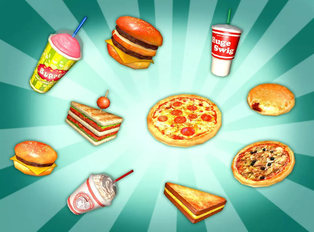 Items (Polygons):- Baked potato (198P)- Burpee (198P)- Burrito (82P)- Cheery meal (158P)- Cheeseburger (170P)- Chicken nuggets box closed (29P)- Chicken nuggets box open (86P)- Chicken nugget (52P)- Chopstick (6P)- Club sandwich (272P)- Coffee (115P)- Corn dog (156P)- Dip - chili mayo (117P)- Dip - ketchup (117P)- Dip - sour cream (117P)- Donut box closed (110P)- Donut box open (66P)- Chocolate donut (132P)- Closed food box (138P)- Closed pizza box (12P)- Cream donut (96P)- Double burger (250P)- Dumpling (99P)- Frappuccino (222P)- Fried chicken (64P)- Fried chicken bucket (96P)- French fries carton (94P)- French fry (10P)- Grilled cheese SW (144P)- Hot dog (150P)- Huge swig (162P)- Jelly donut (84P)- Meatball sub (192P)- Mint donut (96P)- Onion ring (60P)- Onion rings carton (110P)- Open food box (228P)- Open pizza box (54P)- Plate (96P)- Pink donut (132P)- Pizza (80P)- Pizza 02 (80P)- Pizza 03 (80P)- Pizza 04 (80P)- Pizza 05 (80P)- Ribs (180P)- Soda (150P)- Striped donut (132P)- Taco (92P)- Tray (54P)- Takeaway box closed (94P)- Takeaway box open (202P)- TA - Fried rice (88P)- TA - Noodles (88P)- TA - Stir fry (88P)- TA - Pork (88P)