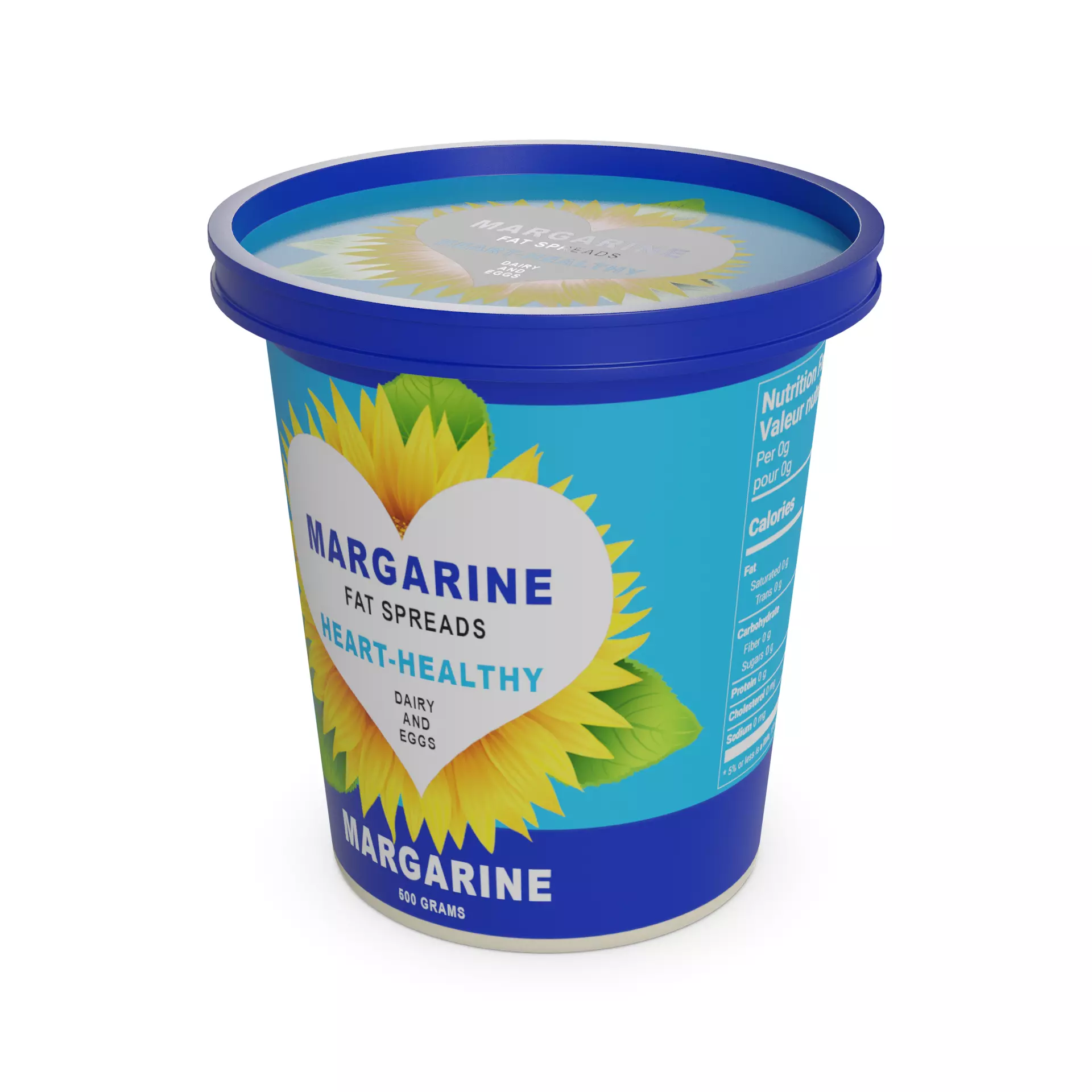 Margarine: A tub of smooth and spreadable margarine, housed in a vibrant blue plastic container. The packaging includes a label with a sunflower graphic and the words Heart-Healthy to highlight its nutritional benefits. The tub contains 500 grams of margarine, making it ideal for cooking, baking, or simply spreading on bread.