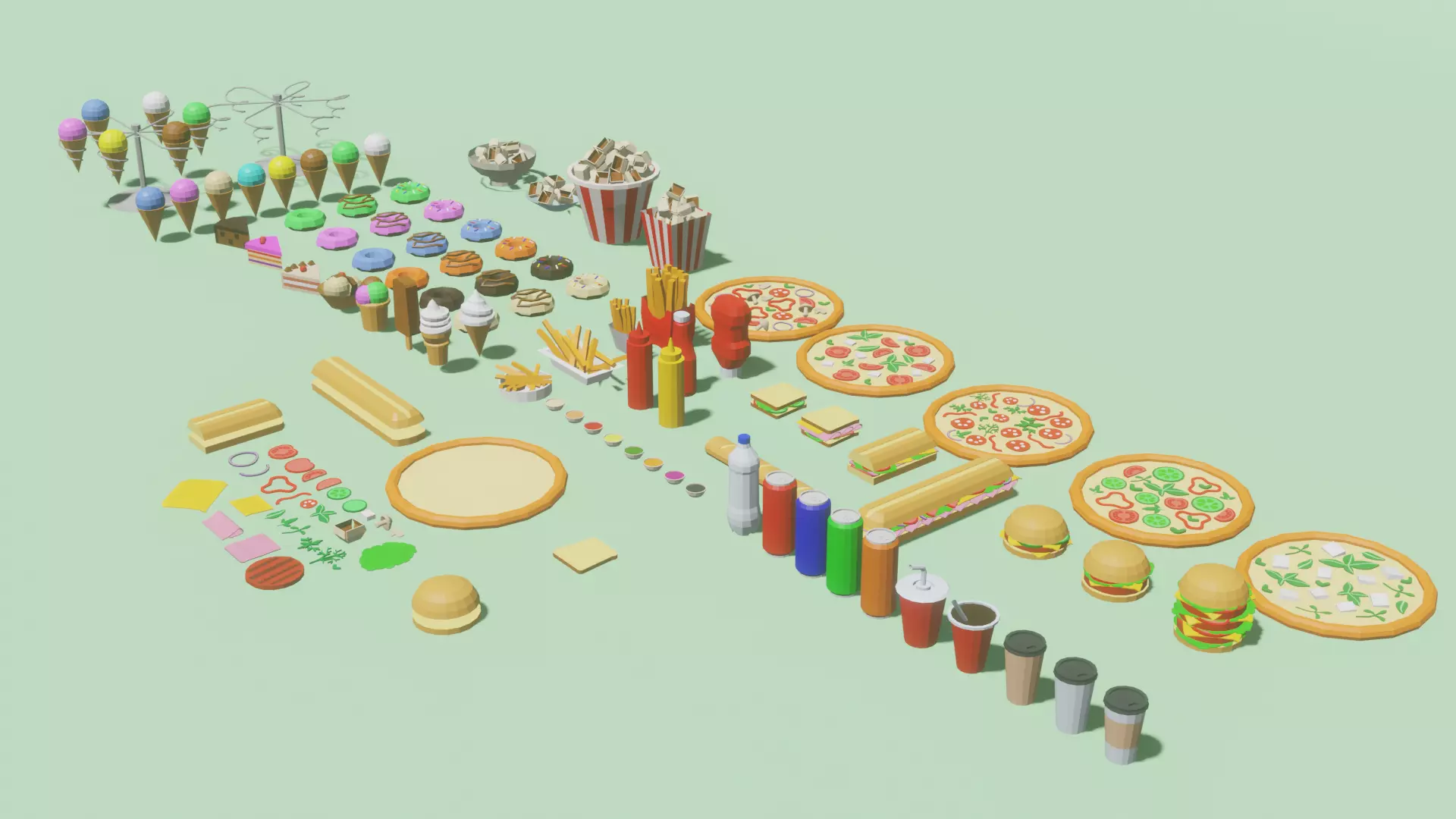 This pack is a combination of the Ice Cream Low-poly Food Pack Low-poly 3D model and Tasty Fast Food Low-poly Pack 3D Low-poly 3D model plus ingredients for creating your own models