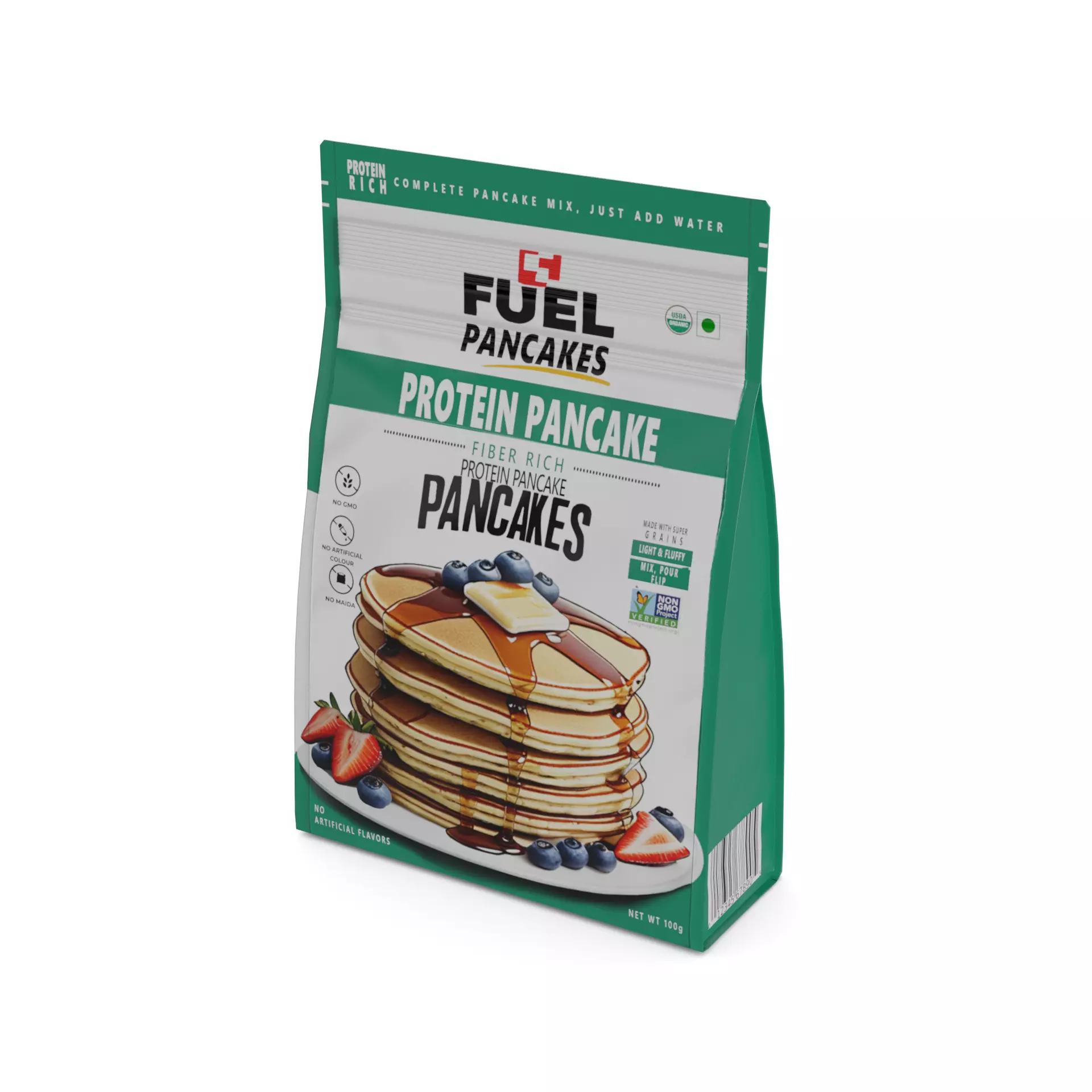 Protein Pancake Mix: A resealable bag filled with protein pancake mix. The bag has a matte finish and a modern design, with a combination of earthy tones like brown and green. The front of the bag showcases the product name and a graphic of a stack of pancakes. On the back, you'll find instructions for preparation and a label that says Fuel your mornings with protein-packed pancakes!