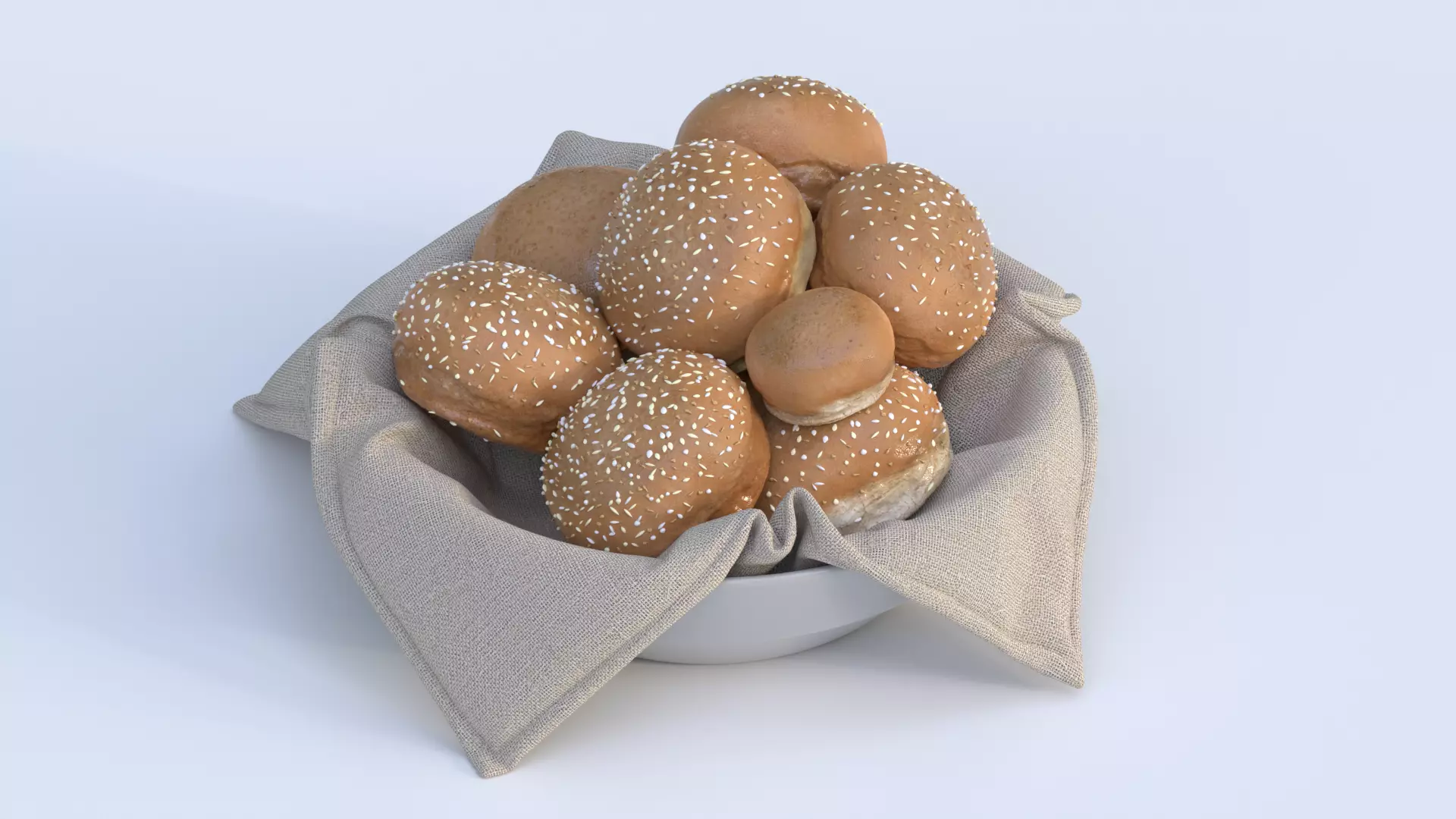 Introducing a mesmerizing 3D scene that will captivate your senses - a stunning portrayal of a white porcelain cup adorned with a beige linen cloth. Unveiling a tantalizing sight, this cup holds within it a delightful assortment of round, freshly baked buns, irresistibly sprinkled with sesame seeds.