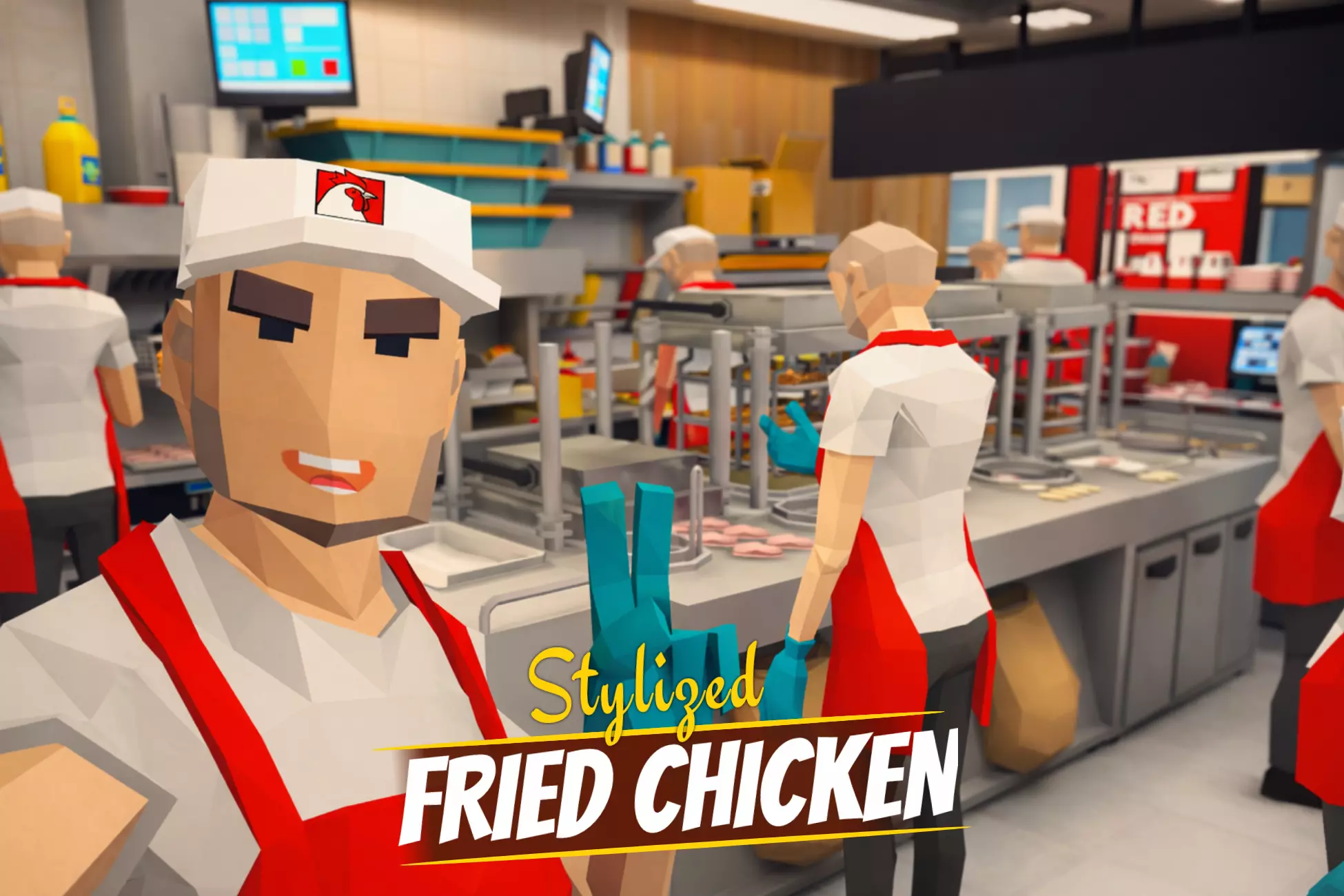 Propsnapkin, spoon, poster (x2), self-service cash register, round table, chair, tray grill, metal tray, fire alarm, ceiling lamp, menu (x2), monitor, exit, gloves, kitchen tray, roller cabinet, deep fryer, table with cups, soda dispenser, sauce pipette, potato cupboard, kitchen table, dough container, metal chicken basket, chicken fryer, refrigerator, trash can, cable, air conditioner, drain, tongs, tablet, potato scoop, mini fridge, salt shaker, serving table, tabletop sign, flat ceiling lamp, box (X2), tray bin, toilet cubicle, toilet, washbasin, soap, toilet urn, bag, wc, dispenser gun, spice, temperature maintenance chamber, table, corner sofa, container, oil, dish shower
