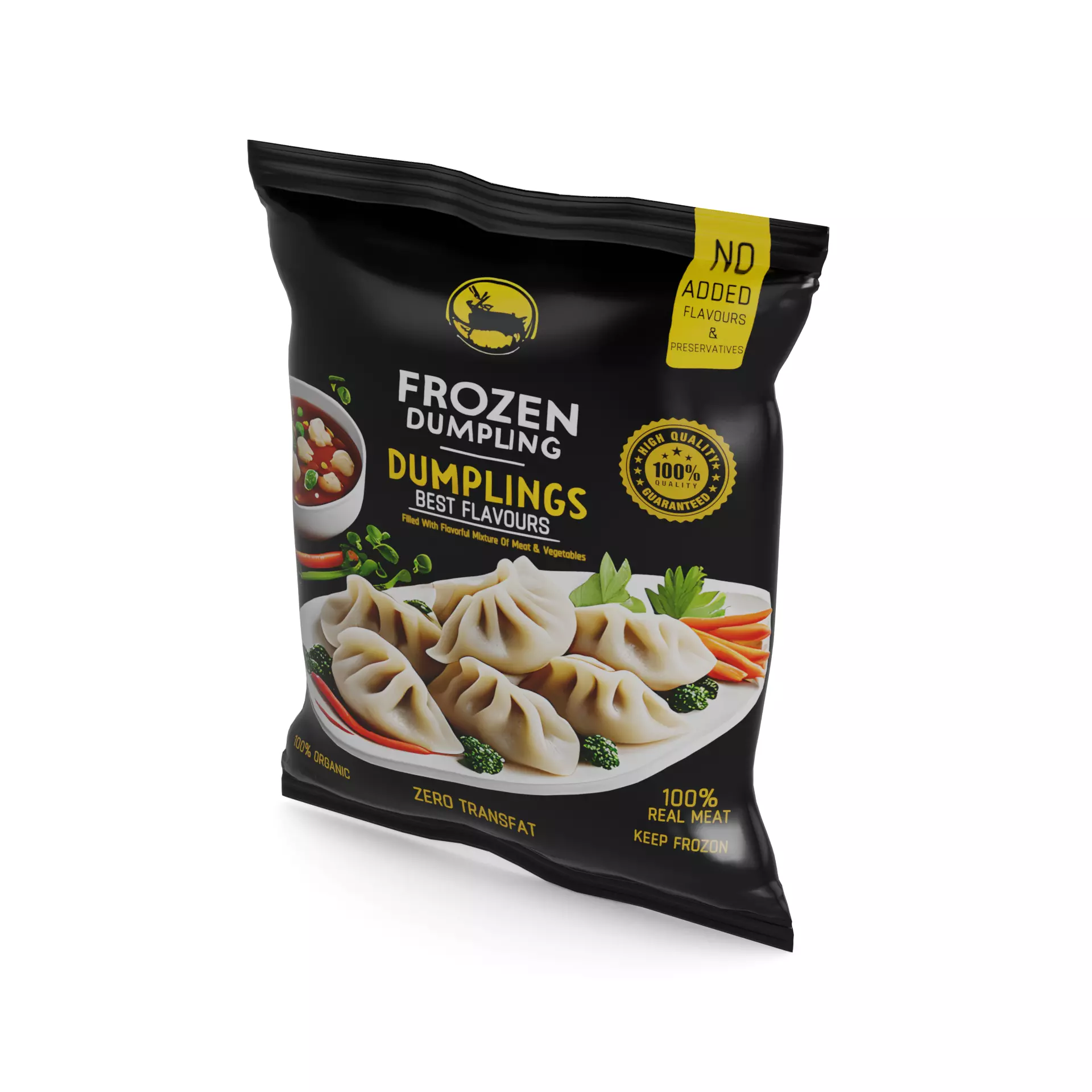 Frozen Dumplings: Treat your taste buds to our mouthwatering frozen dumplings. These delectable bites are filled with a flavorful mixture of meat and vegetables, encased in a soft and chewy wrapper. The packaging showcases a modern design, with a sleek black color scheme and an image of the dumplings on the front. The container is made of eco-friendly materials, promoting sustainability. A label on the packaging provides nutritional information and cooking instructions, making it convenient for you to enjoy these dumplings anytime.