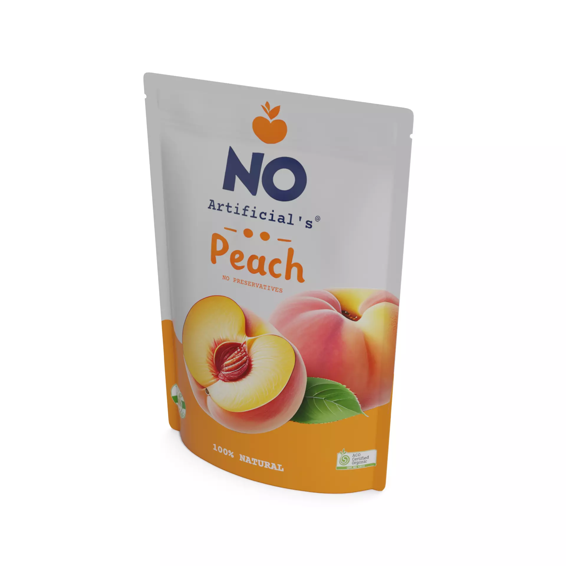 Peach Puree: Enjoy the delicate flavor of ripe peaches in this smooth puree. The packaging is a soft peach-colored pouch with an adorable illustration of a peach and the words No artificial flavors to assure parents of its quality.