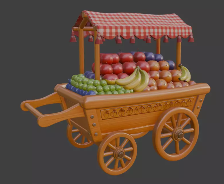 Beautiful and highly detailed 3D model of a cute wooden fruit cart / market stall loaded with fresh fruits. Perfect for games, animation, cartoon scenes, farm markets, village environments, children’s books, or any colorful project.Features: