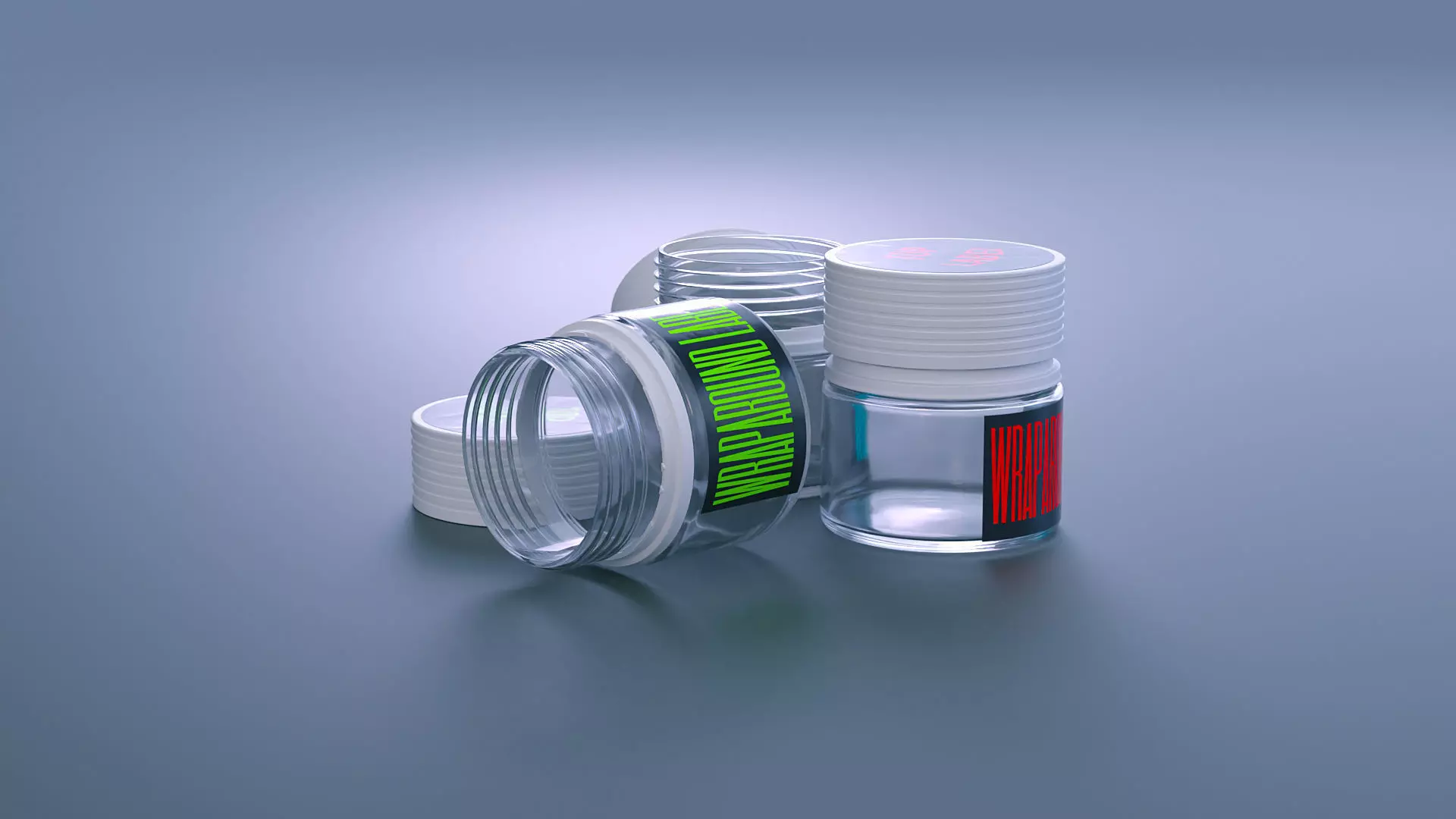 Clear plastic jar with threaded lid and two label areas (side and top).