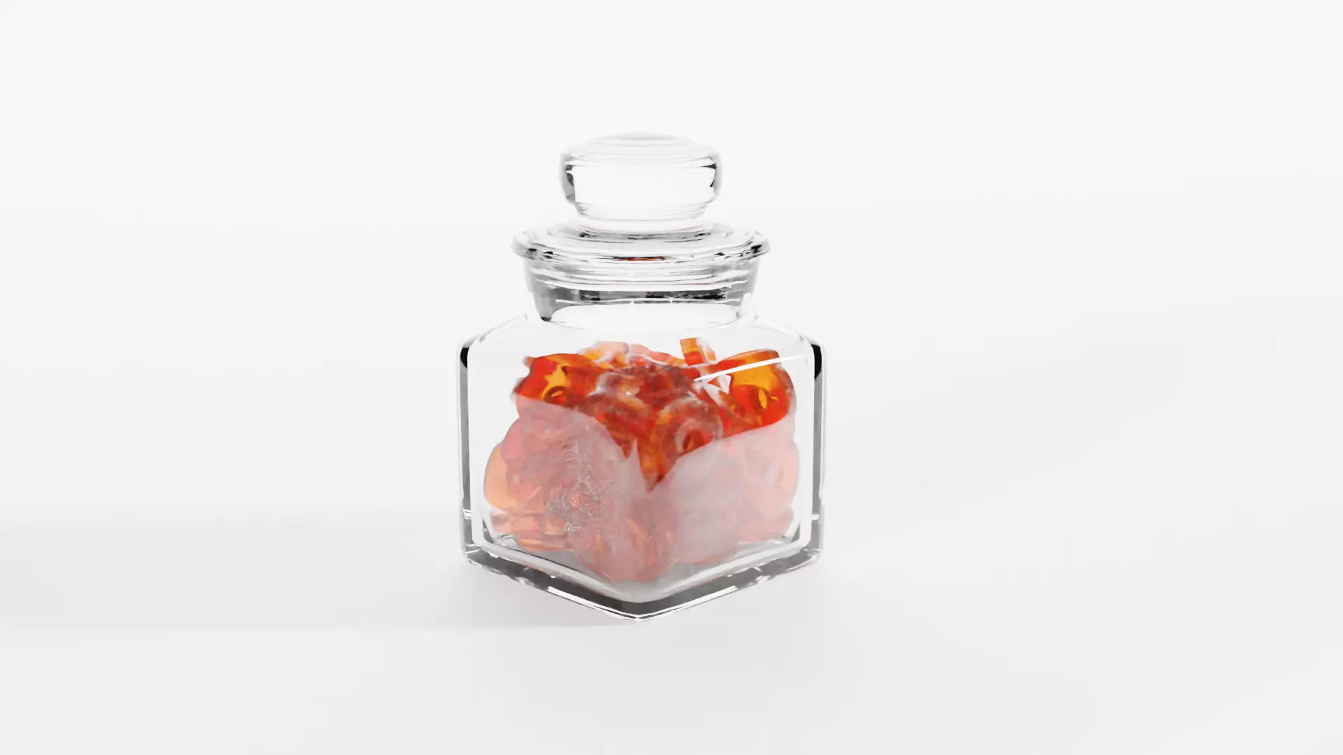 The model has real world scale and measures 10.5 cm in diameter and 16.5 cm in height. The mesh of the lid and the mesh of the actual jar are not connected in Edit Mode, so they can easily be selected and moved individually (same goes for the individual gumdrops).