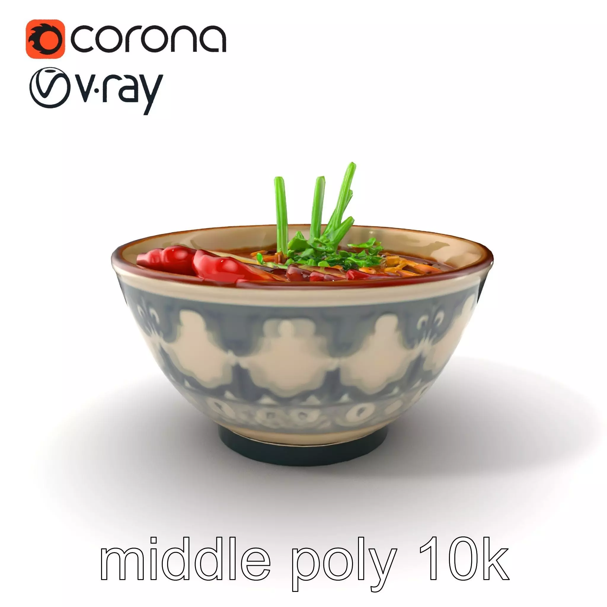 Each model has 3 levels of detail: low-poly, middle-poly, and high-poly, which allows for the use of this model in production rendering (such as 3ds Max, Maya, Cinema 4D, Blender, V-Ray/Corona/Cycles, and all other), game engines (Unity and Unreal compatible), and interactive presentations, providing a choice of detail based on the LOD System principle. Perfect for culinary visualizations, virtual restaurant tours, and detailed food game assets, this model captures the exquisite details of a steaming bowl of ramen with marinated pork, a soft-boiled egg, and green onions in rich broth. The model's textures are PBR, Diffuse, NormalMap, and reflection/roughness/metallic, which are suitable for any modern rendering engine. All models are accurately unwrapped and have no overlapping UVs. The textures are 4096x4096 in size. If you like this model, please leave a comment and a like.