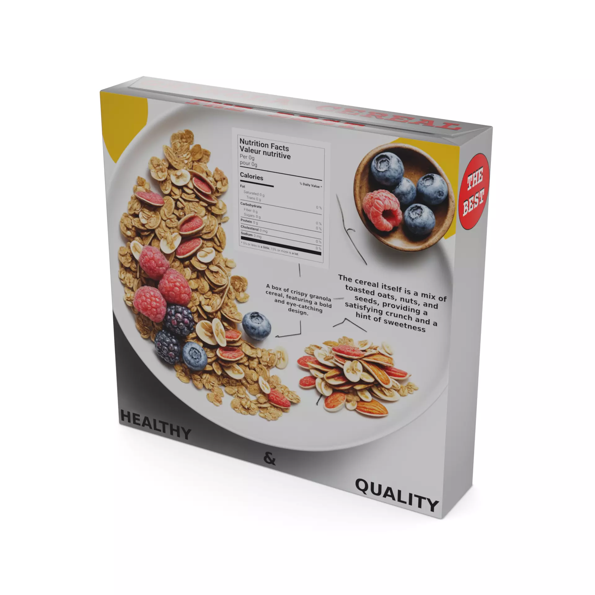 Granola Cereal: A box of crispy granola cereal, featuring a bold and eye-catching design. The packaging showcases a bowl filled with the cereal, topped with fresh berries and a drizzle of honey. The box is labeled with the product name, nutritional facts, and a graphic of a spoonful of cereal. The cereal itself is a mix of toasted oats, nuts, and seeds, providing a satisfying crunch and a hint of sweetness.