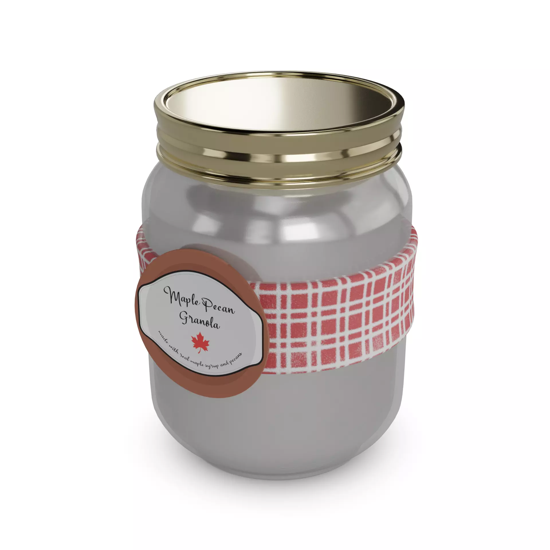 Maple Pecan Granola: A charming mason jar filled with maple pecan granola. The packaging exudes a cozy, homemade feel, with a rustic label featuring handwritten typography and a whimsical illustration of a maple leaf. The front label proudly states Maple Pecan Granola and Made with Real Maple Syrup and Pecans. On the back, you'll find a heartfelt story about the brand's commitment to using high-quality ingredients, along with a serving suggestion and storage tips. The mason jar is topped with a cute fabric lid, adding a touch of nostalgia to the overall presentation.