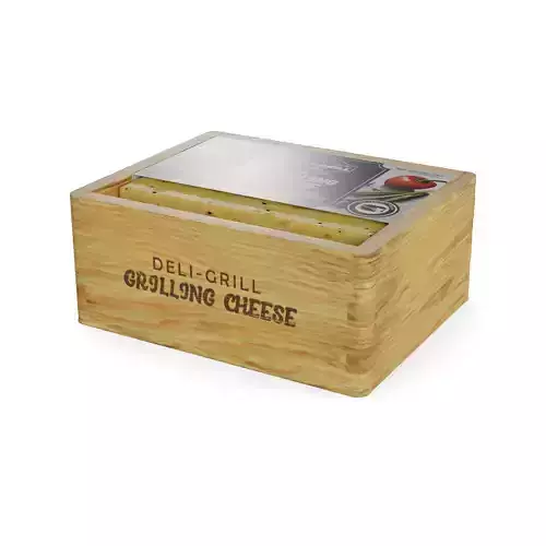Grilling Cheese: Treat yourself to our premium grilling cheese, packaged in a rustic wooden box. The box is adorned with a charming illustration of a grill, showcasing the cheese's grilling capabilities. The label on the box features the words Grilling Cheese in a playful font, adding a touch of whimsy to the packaging. Size: 6 oz.