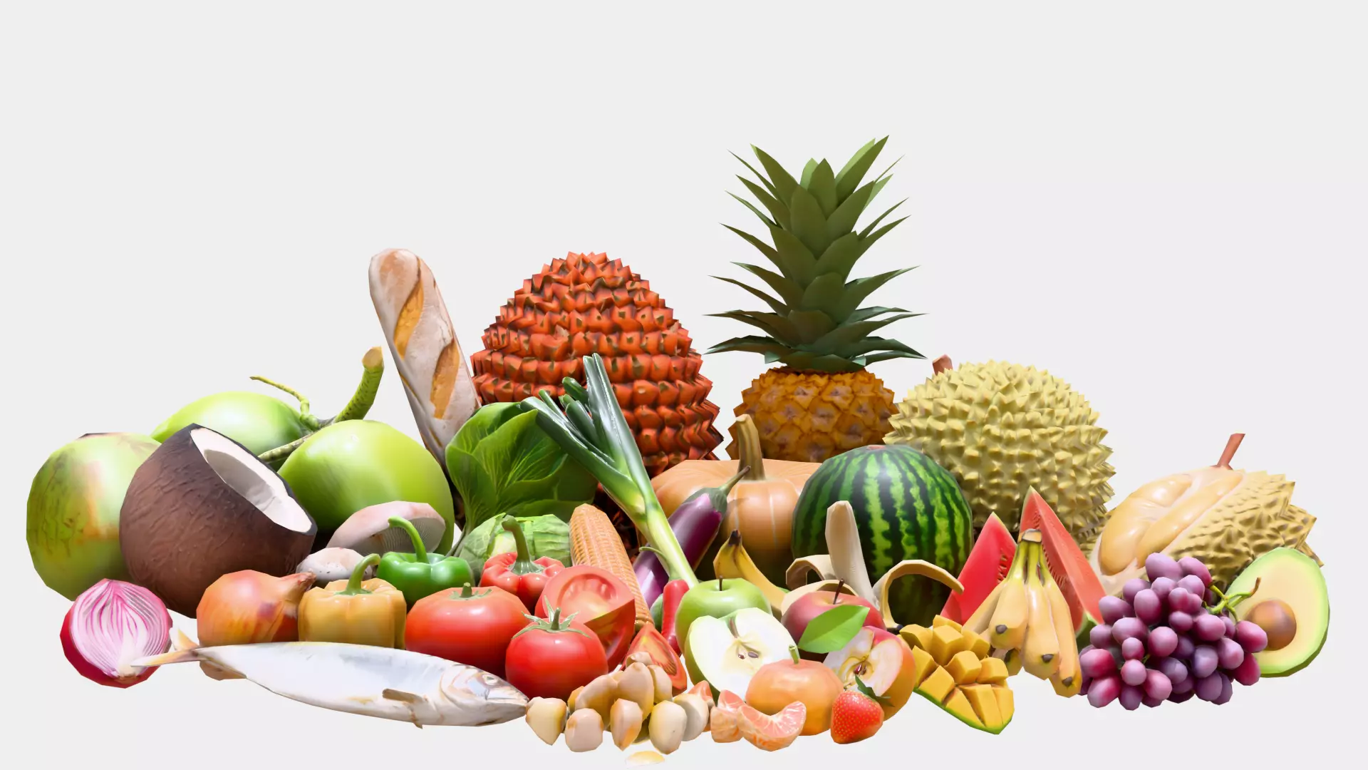 This pack contains 3D models listed below:apple, apple cut, avocado cut, baguette, banana, banana cluster, banana peel, bok choi, button mushroom, mushroom, cabagge, chili, coconut, coconut cut, corn cucumber, durian, durian cut, eggplant, garlic cluster, grapes, green apple, green apple cut, green bell pepper, leek, mackerel, oil palm fruit cluster / sawit, onion, orange slice, pineapple, pumpkin, red bell pepper, red onion cut, mango slice, strawberry, tomatoe, tomatoe cut, watermellon, yellow bell pepper