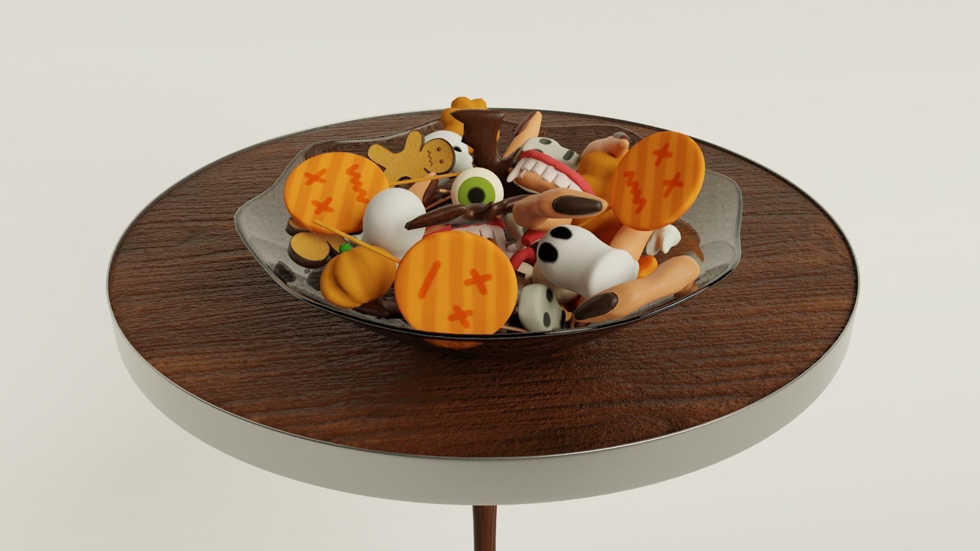 A small set of Halloween sweets which includes:12 sweets1 table2 plates and 1 glass.For all models of sweets, there are textures. There are no textures for the metal rim of the table, glass and ceramic utensils. For them, standard shaders were used.All models can be subject to additional smoothing if necessary.Texture size 1024x1024