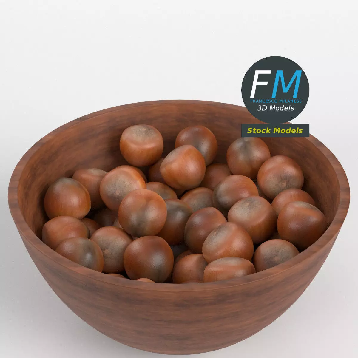 Hazelnuts in a bowl 3D Model. 59 individual hazelnuts and a bowl sharing the same OVERLAPPING UV Layout map, Material and PBR Texture set. Production-ready 3D Model, with PBR materials, textures, overlapping UV Layout map provided in the package.Quads only geometries (no tris/ngons).Easily customizable: UV unwrapped geometries; UV Layout maps provided in the package as png with alpha images.Each Object, Material or Texture provided in the package has a unique, meaningful name.Made in Blender 3.3 with Cycles Principled BSDF PBR shader with textures included (Eevee compatible), then exported to OBJ and FBX (with embedded PBR Textures); materials and textures made in Substance Painter, exported for PBR, Cycles, V-Ray, Unity, Unreal.PROMO IMAGES: the first image has been rendered in Cycles for Blender; in particular, you can find 11+ promo images in this description: