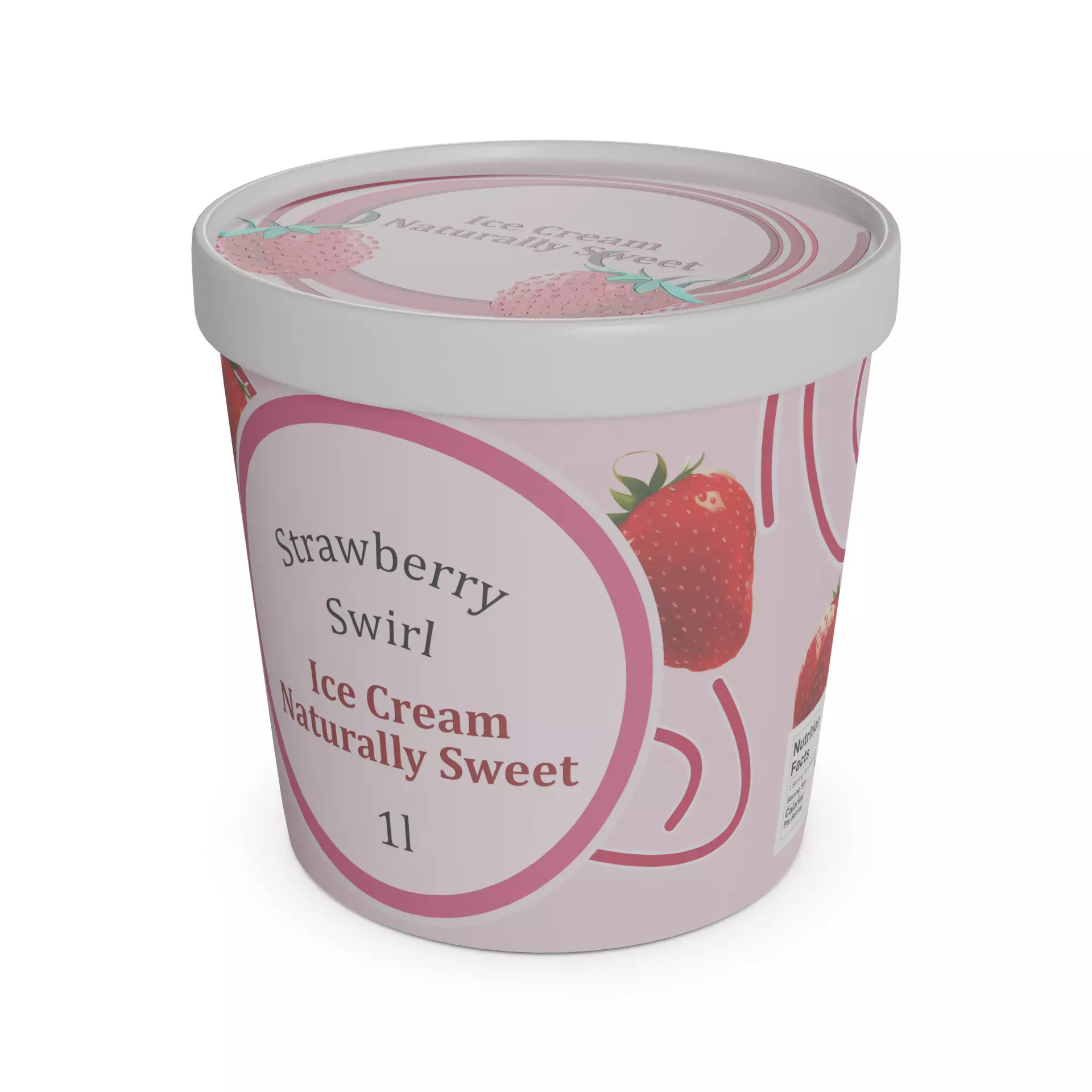 Strawberry Swirl Ice Cream Tub: Experience the refreshing taste of summer with our Strawberry Swirl Ice Cream. The tub is made of eco-friendly cardboard, featuring a charming design of strawberries and swirls. The label includes the words Strawberry Swirl Ice Cream and Naturally Sweet. Inside, you'll discover 1 liter of luscious strawberry-flavored ice cream, complete with swirls of real strawberry sauce.