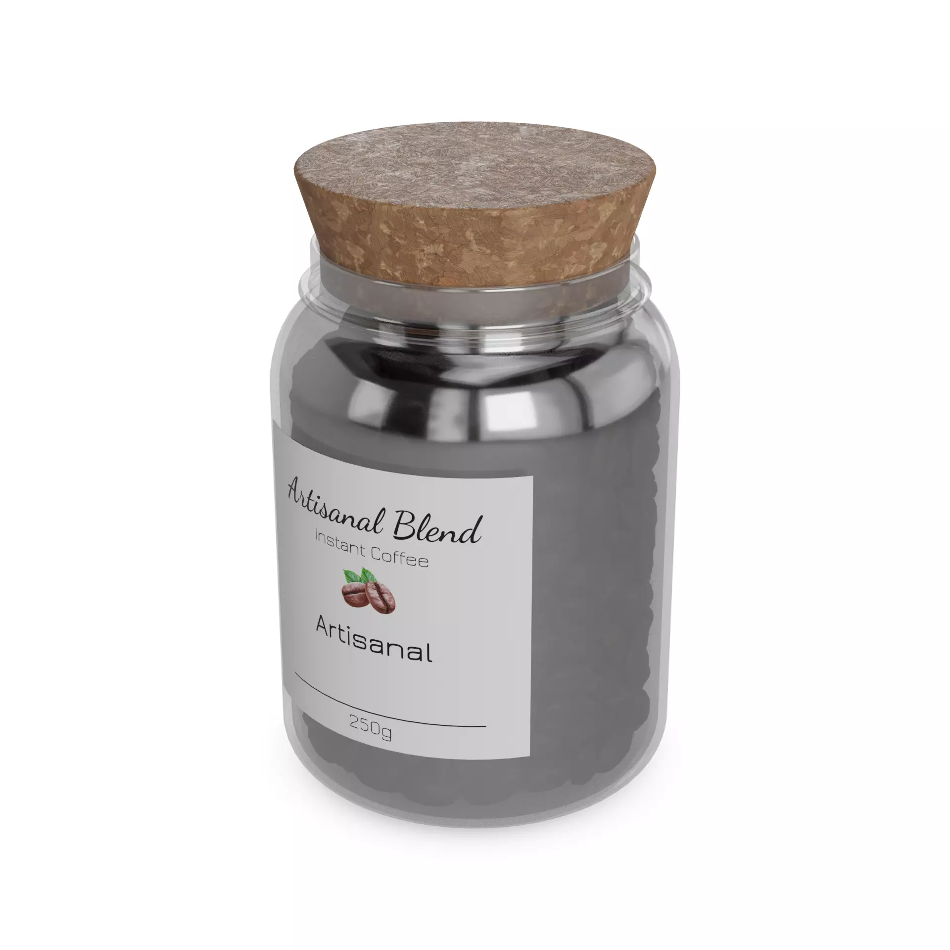 Instant Coffee: This elegant glass jar holds 250g of finely ground instant coffee. The packaging is adorned with a sophisticated label featuring a coffee plant illustration and the words Artisanal Blend in elegant script. The jar is sealed with a cork lid, adding a touch of rustic charm to your coffee collection.