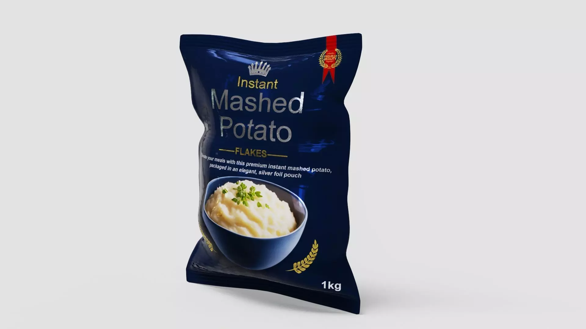 Instant Mashed Potato: Elevate your meals with this premium instant mashed potato, packaged in an elegant, silver foil pouch. The pouch is adorned with a sophisticated design, featuring a subtle embossed pattern and a glossy finish. The packaging exudes a sense of luxury, with a color scheme that combines shades of silver and navy blue. Inside, you'll find 1kg of high-quality potato flakes, carefully selected for their superior taste and texture. The label includes a gold seal, indicating the product's premium quality, along with serving suggestions and cooking tips.