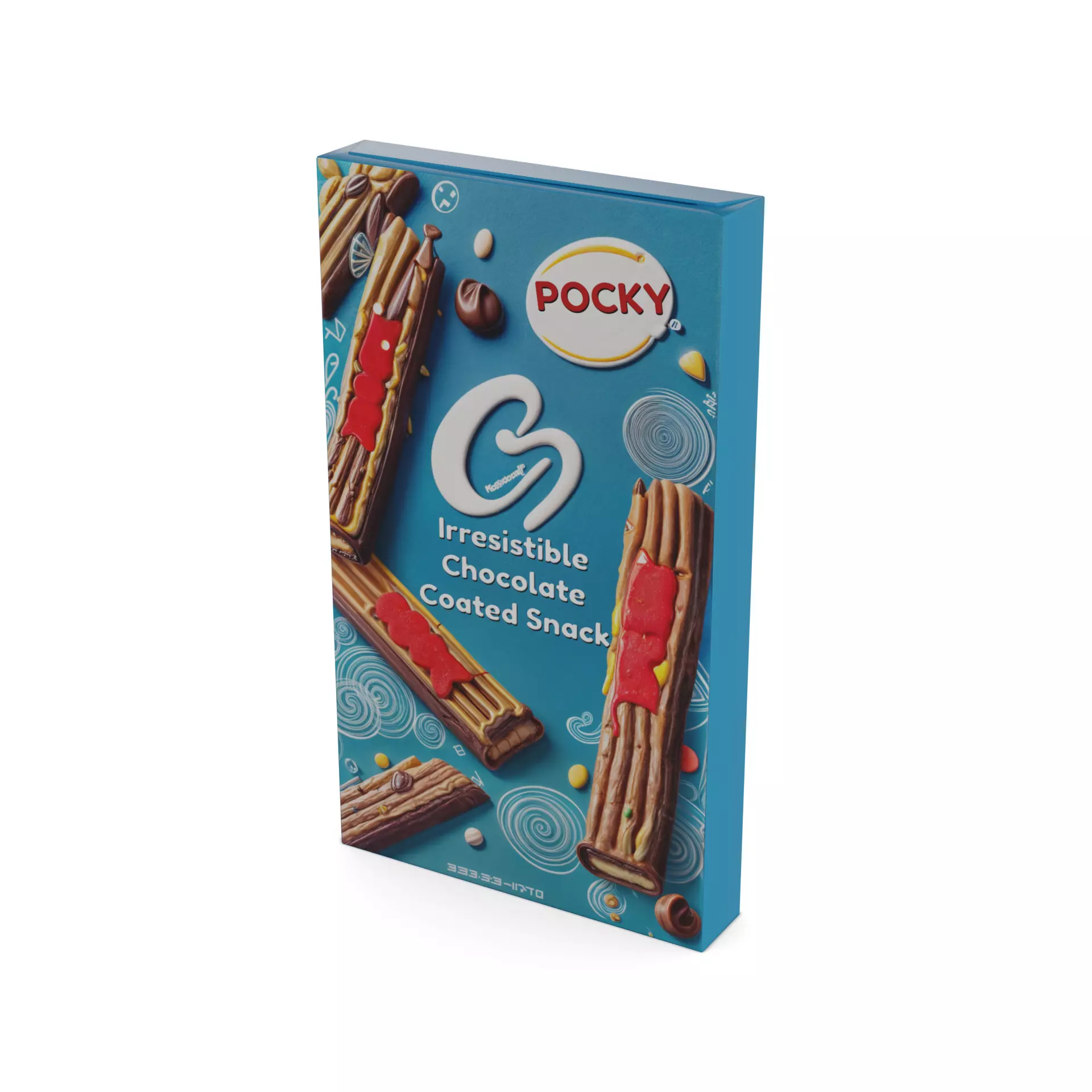 Pocky: Crispy biscuit sticks coated with a layer of creamy chocolate, packaged in a slender and colorful box. The packaging design features a playful pattern of various colors, creating a visually appealing look. The box is easy to open and reseal, allowing for convenient snacking. A label on the packaging includes a graphic of a biscuit stick and the text Irresistible Chocolate Coated Snack to highlight their indulgent nature.