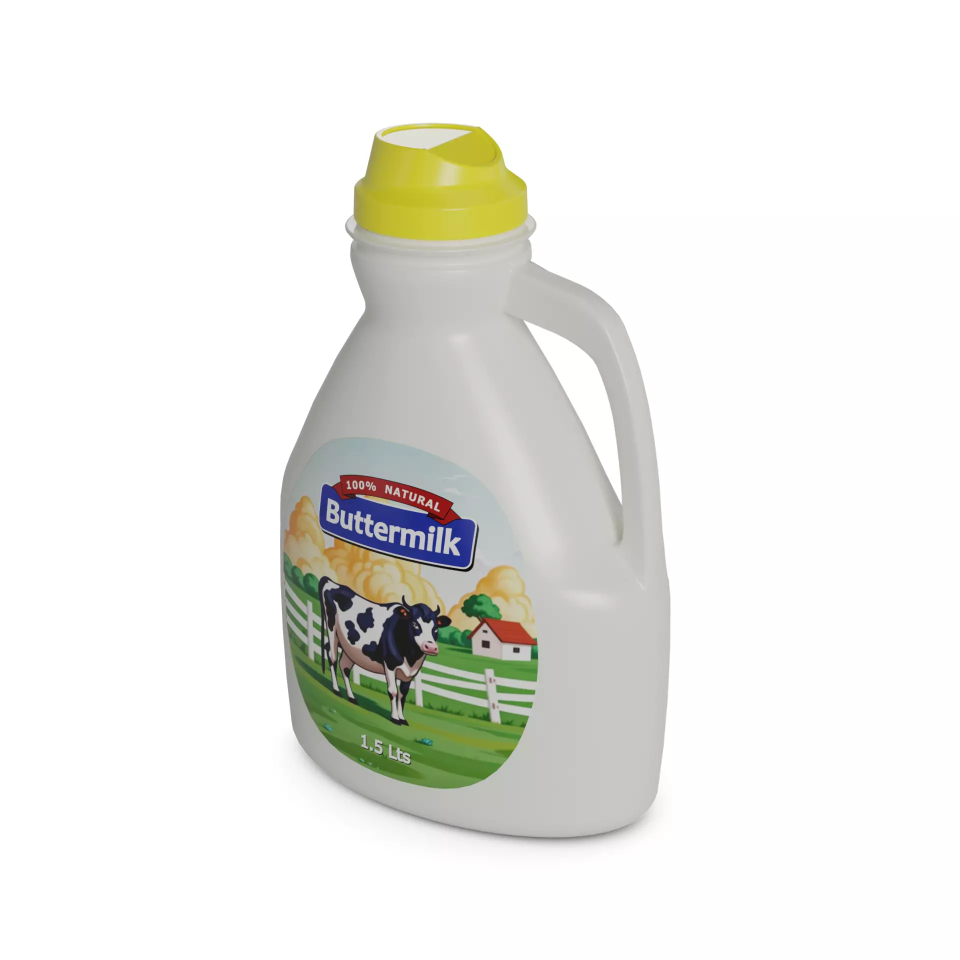 Buttermilk: Presented in a sturdy plastic jug with a handle and a twist-off cap, buttermilk is easy to pour and store. The packaging features a vibrant yellow and green color scheme, with a cheerful cow illustration to evoke a sense of freshness and quality. The jug contains 1.5 liters of creamy and slightly tangy buttermilk, perfect for all your baking and cooking needs.