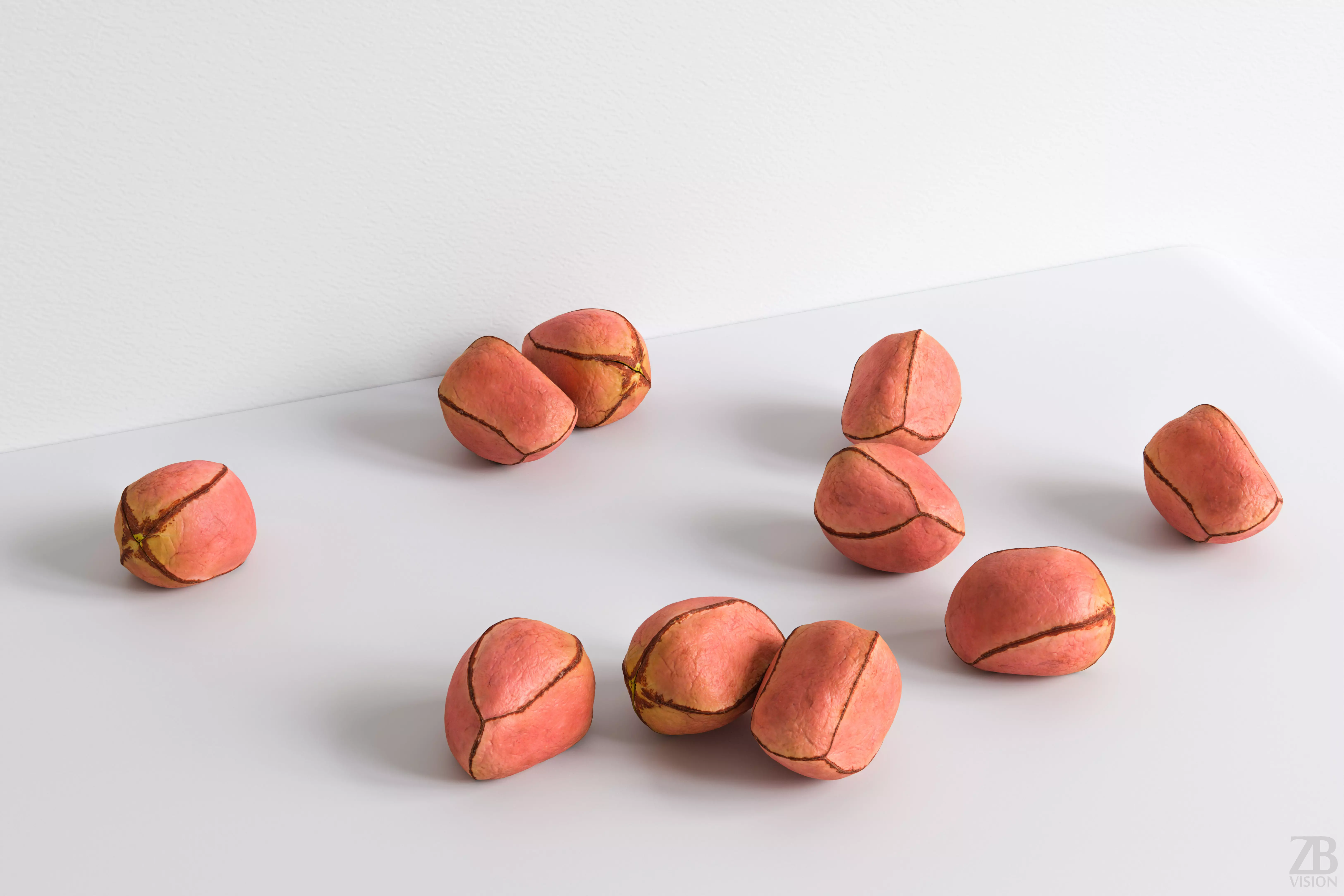 6 maps are supplied with this model. Textures supplied are in JPG format and are in 2K, 4K and 8K resolution. The texture maps include ao, diffuse, glossiness, roughness, normal and displacement(tif). The cola nut model is uvw unwrapped. 16K diffuse included.
